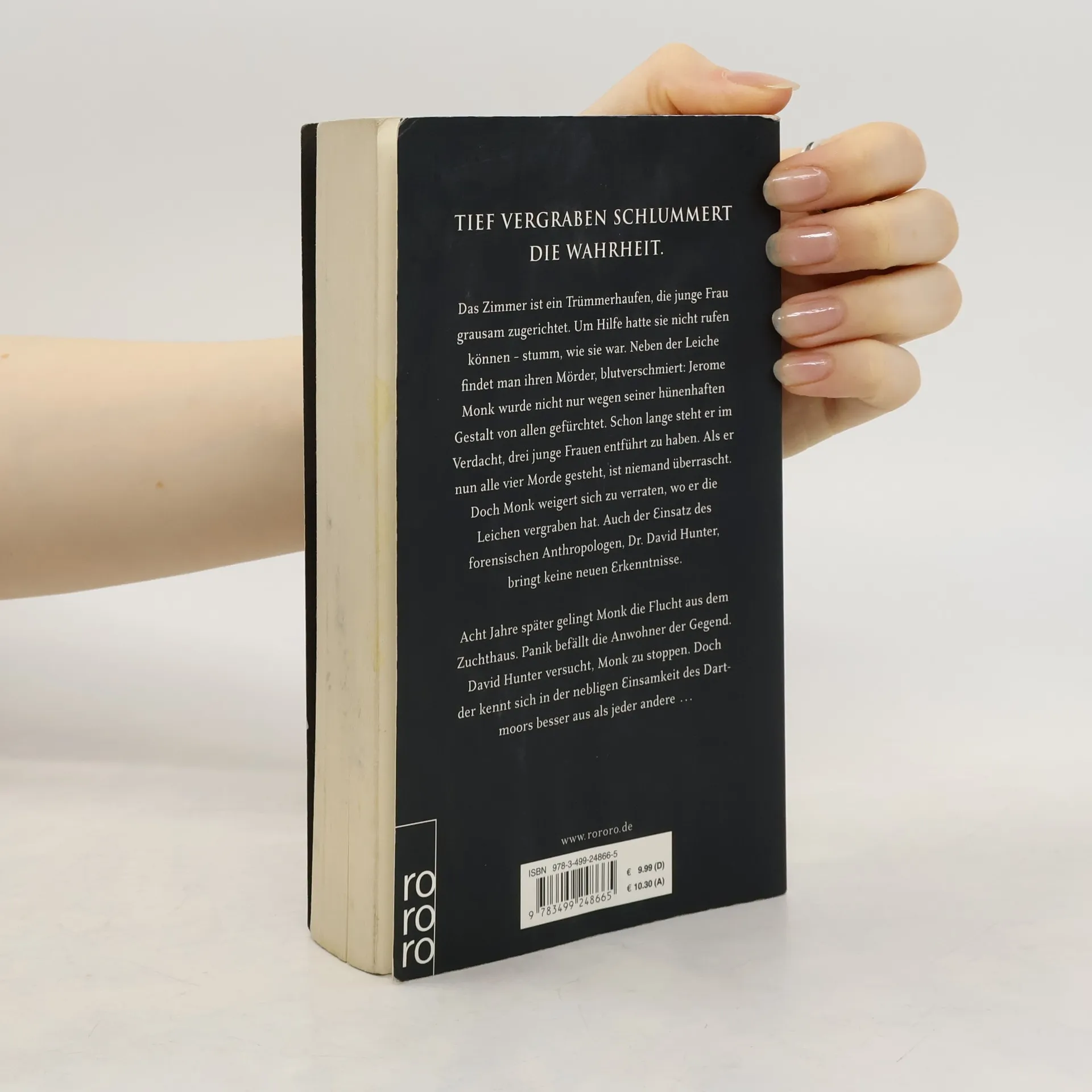 Tief vergraben schlummert die Wahrheit. Das Zimmer ist ein Trümmerhaufen, die junge Frau grausam zugerichtet. Neben der Leiche findet man den Mörder, blutverschmiert: Schon lange steht Jerome Monk im Verdacht, drei junge Frauen getötet zu haben. Als er nun alle vier Morde gesteht, ist niemand überrascht. Doch Monk weigert sich zu verraten, wo er die Leichen vergraben hat. Auch der Einsatz des forensischen Anthropologen, Dr. David Hunter, bringt keine neuen Erkenntnisse. Acht Jahre später gelingt Monk die Flucht aus dem Zuchthaus. Panik befällt die Anwohner der Gegend. David Hunter versucht, Monk zu stoppen. Doch der kennt sich in der nebligen Einsamkeit des Dartmoor besser aus als jeder andere ...