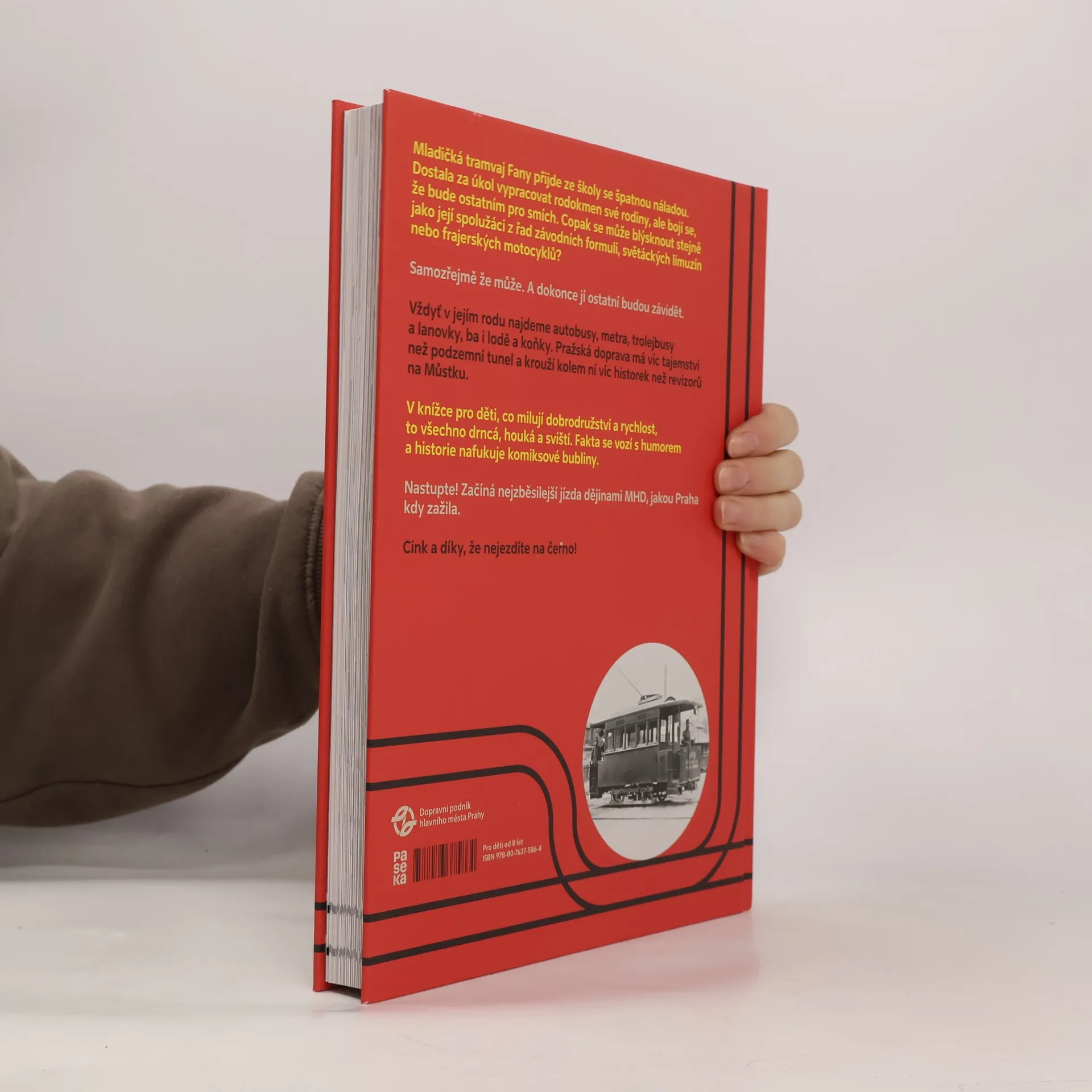 Mladičká tramvaj Fany přijde ze školy se špatnou náladou. Dostala za úkol vypracovat rodokmen své rodiny, ale bojí se, že bude ostatním pro smích. Copak se může blýsknout stejně jako její spolužáci z řad závodních formulí, světáckých limuzín nebo frajerských motocyklů? Samozřejmě že může. A dokonce jí ostatní budou závidět. Vždyť mezi jejími příbuznými najdeme autobusy, metra, trolejbusy a lanovky, ba i lodě a koňky. Pražská doprava má víc tajemství než podzemní tunel a krouží kolem ní víc historek než revizorů na Můstku. V knížce pro děti, co milují dobrodružství a rychlou jízdu, to všechno drncá, houká a sviští. Fakta se vozí s humorem a historie troubí na komiks. Nastupte! Začíná nejzběsilejší jízda dějinami MHD, jakou Praha kdy zažila. Cink, a díky, že nejezdíte na černo!