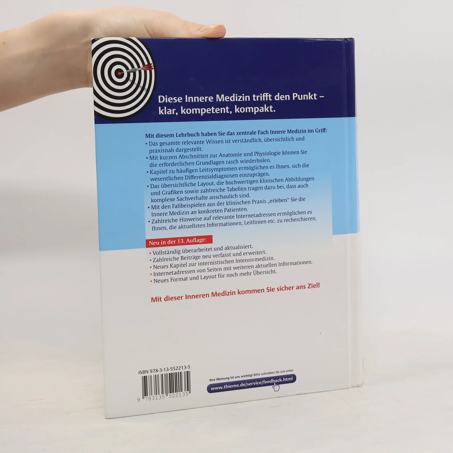 Diese Innere Medizin trifft den Punkt - klar, kompetent, kompakt.Die komplette Innere Medizin mit allen prüfungsrelevanten ThemenAusführlich dargestellte Differenzialdiagnosen und LeitsymptomeÜbersichtliche Gliederung mit FarbleitsystemAuch für den Anfänger ohne Vorkenntnisse verständlichÜber 40 namhafte Autoren garantieren für hohe inhaltliche Qualität und AktualitätSchönes, ansprechendes, komplett vierfarbiges Layout und eine Vielzahl qualitativ hochwertiger AbbildungenInhaltDie gesamte Innere Medizin in 55 Kapiteln zusammengefasst in 15 BuchteilenInhalte auf Prüfungs- und Praxisrelevanz getestetZahlreiche klinische Bezüge und kleine FallgeschichtenAnatomische und physiologische Grundlagen zu KapitelbeginnViele hilfreiche Merkekästen und praktische TippsAnhang mit ausführlichen Laborwerten und AbkürzungsverzeichnisNeuDer Klassiker seit 30 Stetig optimiert und auf die Bedürfnisse der Studenten zugeschnitten.Neues, modernes, vierfarbiges Layout mit übersichtlicher, einheitlicher GliederungNeues Format und Hardcover-EinbandGründliche Überarbeitung und Aktualisierung aller KapitelZahlreiche moderne, neue klinische AbbildungenErweiterung durch klinische Bezüge und FallbeispieleAnatomische und physiologische Grundlagen zu Beginn der meisten KapitelNeues Kapitel Internistische Intensivmedizin