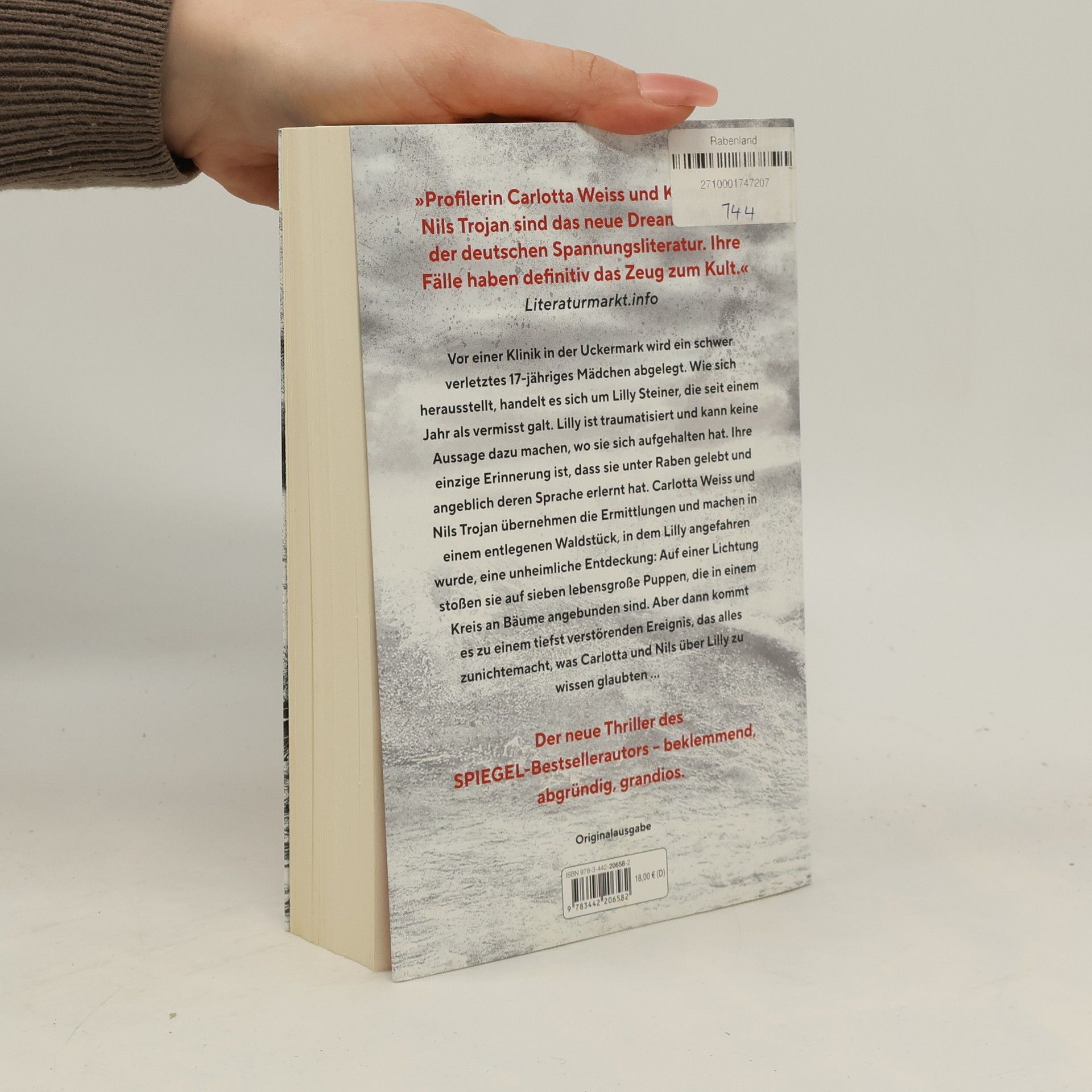 Ein Mädchen ohne Erinnerung und ein verstörender Fund auf einer einsamen Lichtung im Wald: der zweite Fall für Carlotta Weiss und Nils Trojan.Vor einer Klinik in der Uckermark wird ein schwer verletztes 17-jähriges Mädchen abgelegt. Wie sich herausstellt, handelt es sich um Lilly Steiner, die seit einem Jahr als vermisst galt. Lilly ist traumatisiert und kann keine Aussage dazu machen, wo sie sich aufgehalten hat. Ihre einzige Erinnerung ist, dass sie unter Raben gelebt und angeblich deren Sprache erlernt hat. Carlotta Weiss und Nils Trojan übernehmen die Ermittlungen und machen in einem entlegenen Waldstück, in dem Lilly angefahren wurde, eine unheimliche Entdeckung: Auf einer Lichtung stoßen sie auf sieben lebensgroße Puppen, die in einem Kreis an Bäume angebunden sind. Kurz darauf erhalten sie eine zutiefst verstörende Nachricht: Lilly wurde im Krankenhaus ermordet. Was wusste sie, das so gefährlich war, dass sie mit ihrem Leben dafür bezahlen musste?