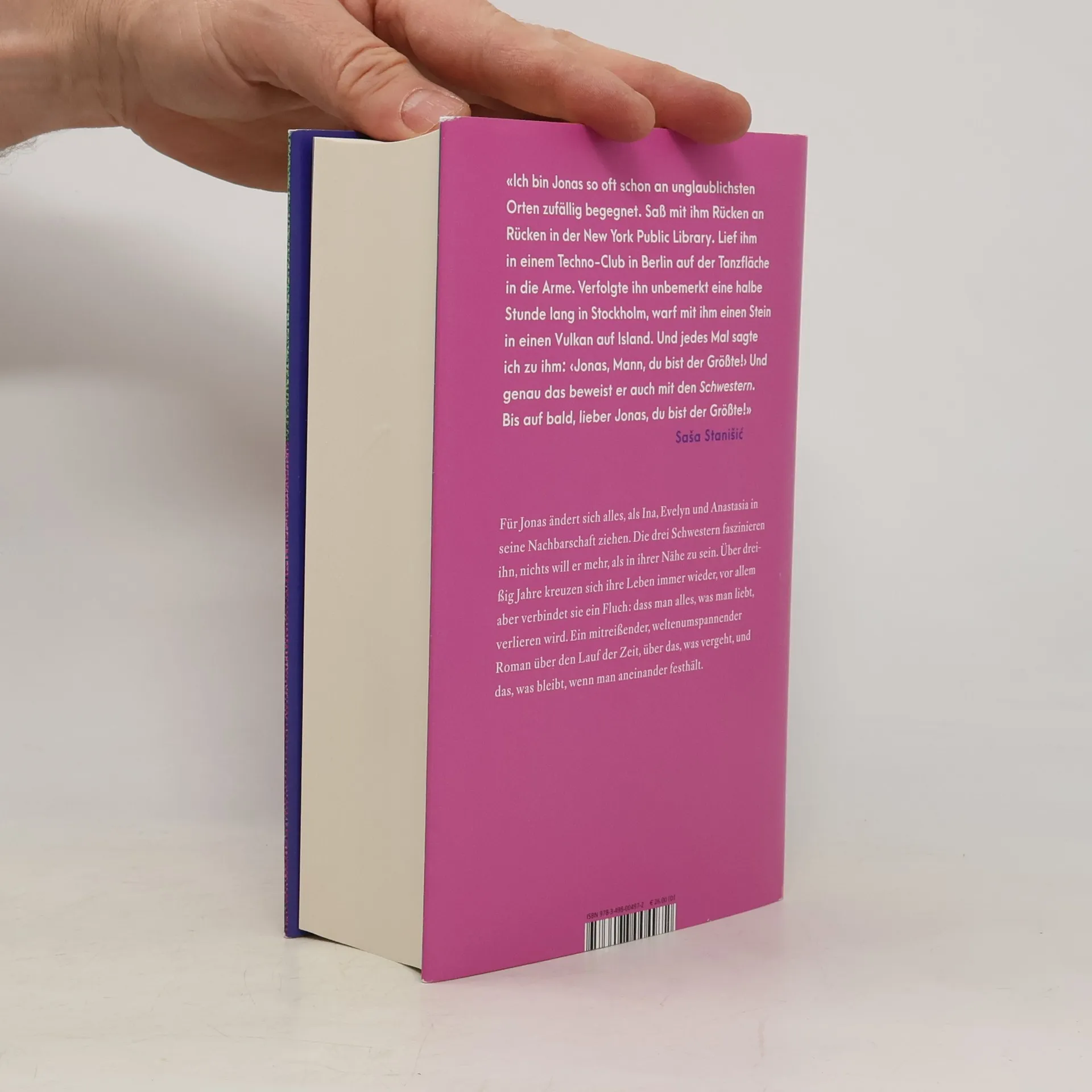 Ein weltenumspannender Roman über drei Schwestern und einen Mann, dessen Leben mit ihnen eng verflochten ist – und über den Fluch der Zeit, über das, was vergeht, und das, was bleibt, wenn man aneinander festhält..Für Jonas ändert sich alles, als Ina, Evelyn und Anastasia in seine Nachbarschaft ziehen. Ihre Mutter kommt aus Tunesien, wer ihr Vater ist, weiß niemand. Die ernsthafte Ina, die verträumte Evelyn und die chaotische Anastasia faszinieren den Erzähler, nichts will er mehr, als in ihrer Nähe zu sein. Ihm wird klar, dass die Schwestern mit seiner Familie und der Vergangenheit seines Vaters eng verflochten sind. Über dreißig Jahre kreuzen sich ihre Leben immer wieder, in Tunesien, Schweden, den USA, sie erleben Liebesgeschichten und Lebenskrisen. Vor allem aber verbindet sie ein dass man alles, was man liebt, verlieren wird.«Ich bin Jonas so oft schon an unglaublichsten Orten zufällig begegnet. Saß mit ihm Rücken an Rücken in der New York Public Library. Lief ihm in einem Techno-Club in Berlin auf der Tanzfläche in die Arme. Verfolgte ihn unbemerkt eine halbe Stunde lang in Stockholm, warf mit ihm einen Stein in einen Vulkan auf Island. Und jedes Mal sagte ich zu ‹Jonas, Mann, du bist der Größte!› Und genau das beweist er auch mit den "Schwestern". Bis auf bald, lieber Jonas, du bist der Größte!» Saša Stanišić