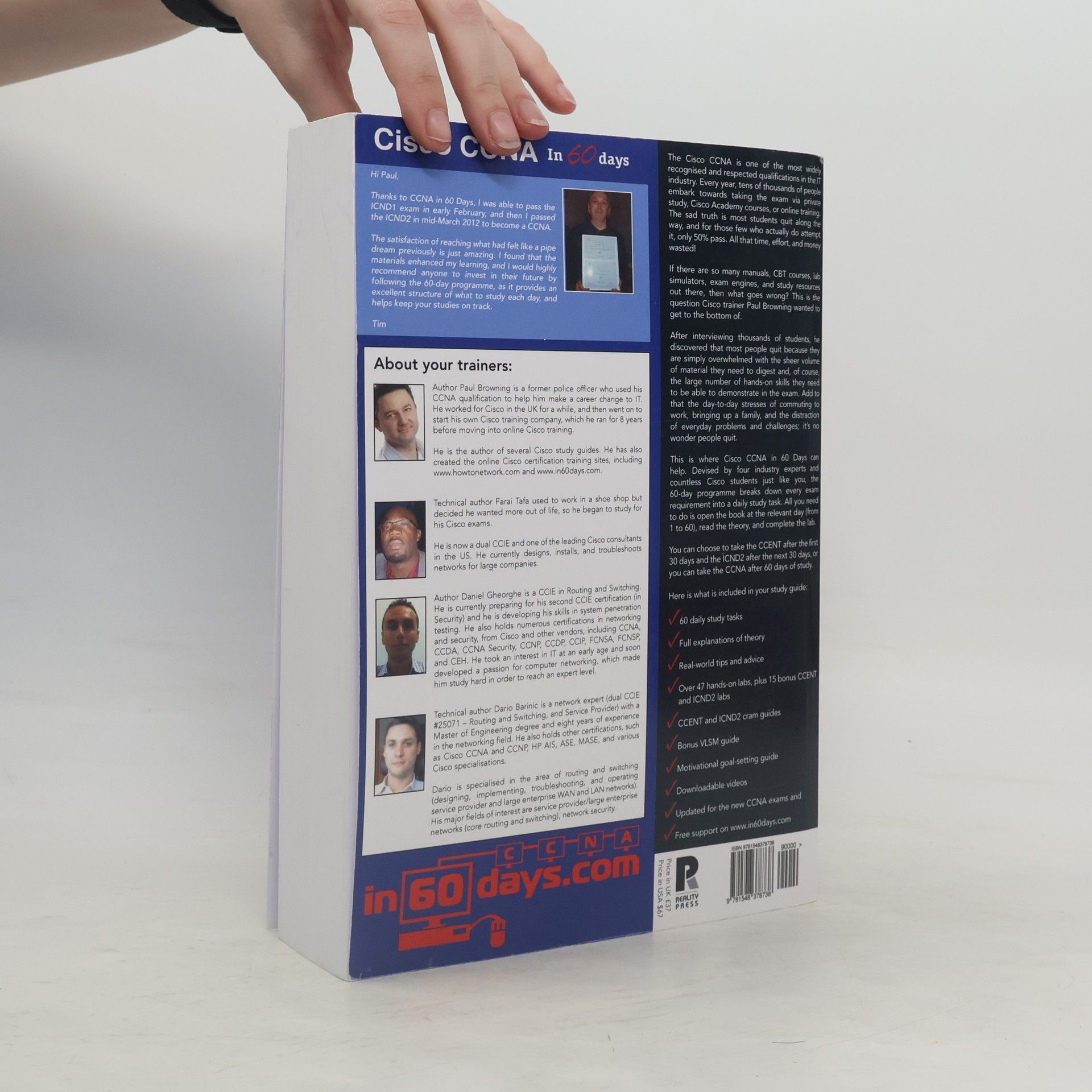 AMAZON BESTSELLER Version 3 - Completely revised and updated for the new Cisco exams: 200-125 CCNA 100-105 ICND1 200-105 ICND2 This book has been used by thousands of Cisco students to study for their CCNA exams. Written by a CCNP and three CCIEs it's all you need to pass the new style exams. FREE SUPPORT The book is supported for free so just come over and register your copy to get free access to over $400 worth of videos, exams, cram guides - in60days.com/free/ccnain60days/ ABOUT THE BOOK Do any of the following problems sound familiar to you? "I just don't know where to start studying. I feel overwhelmed by the information." "I've bought all the CBT-style videos and books, and have even been on a course, but I don't feel ready to take the exam and I don't know if I ever will." "I've been studying for a long time now, but I haven't booked the exam yet because I just don't feel ready." For every ten students who start out towards the CCNA qualification, nine quit. They don't quit because of laziness but because they became overwhelmed with information and didn't even know where to start. They sat down to study from one of the 'big name' manuals and half an hour later found themselves staring blankly at the same page. Can you imagine how frustrating that feels? You see, most authors throw you in at the deep end and expect you to get on with it. They forget that you have a full-time job, a long journey back home, family commitments and any number of challenges going on in your life. The last thing you have time for is to write out a detailed study plan with plenty of review sessions. If only somebody could tell you what to study each day, every day. If only you could open your study guide and see which bit of theory to read, which lab to do and which exam to take. You could then get on with the task of studying and getting that exam nailed. This is where Cisco CCNA in 60 Days comes in. Written in response to feedback from thousands of students using my online CCNA in 60 days program, my classroom courses and my other online Cisco training websites this book is the final piece in the studying puzzle. HOW IT WORKS Every day you read your theory module, you review yesterdays lesson, do a lab and then answer some review questions. The next day you do the same until you reach the review sessions where you cement all your knowledge with more labs and review as well as some practice exams. If that wasn't enough, you have a cram guide to read daily and an online Subnetting review site to really hone your subnetting skills. At the 30 day mark you can take your CCENT exam and move into yourICND2 study sessions or just take your CCNA exam at the end of 60 days. If you fall behind no problem, just pick up where you left off. WHAT'S COVERED? Every subject Cisco want you to know for your exams is covered with labs, theory, exams, reviews and crams. From RIP to OSPF, from VLSM to CIDR, IPv4 to IPv6, STP to CDP. Every exam topic is covered in detail many times over. Just when you think you are ready you are hit with challenge labs and more exams to ensure you are more than ready for the tricky Cisco exams. There are over 60 hand-on labs in total to help you build your configuration skills and confidence. ABOUT THE AUTHORS Paul Browning used to work at Cisco TAC but left in 2002 to start his own Cisco training company. He has authored several Cisco manuals as well as created one of the biggest online Cisco training websites used by many thousands of students. Farai Tafa is a dual CCIE who consults for large blue chip companies in the USA. Daniel Gheorghe is a CCIE in Routing and Switching.