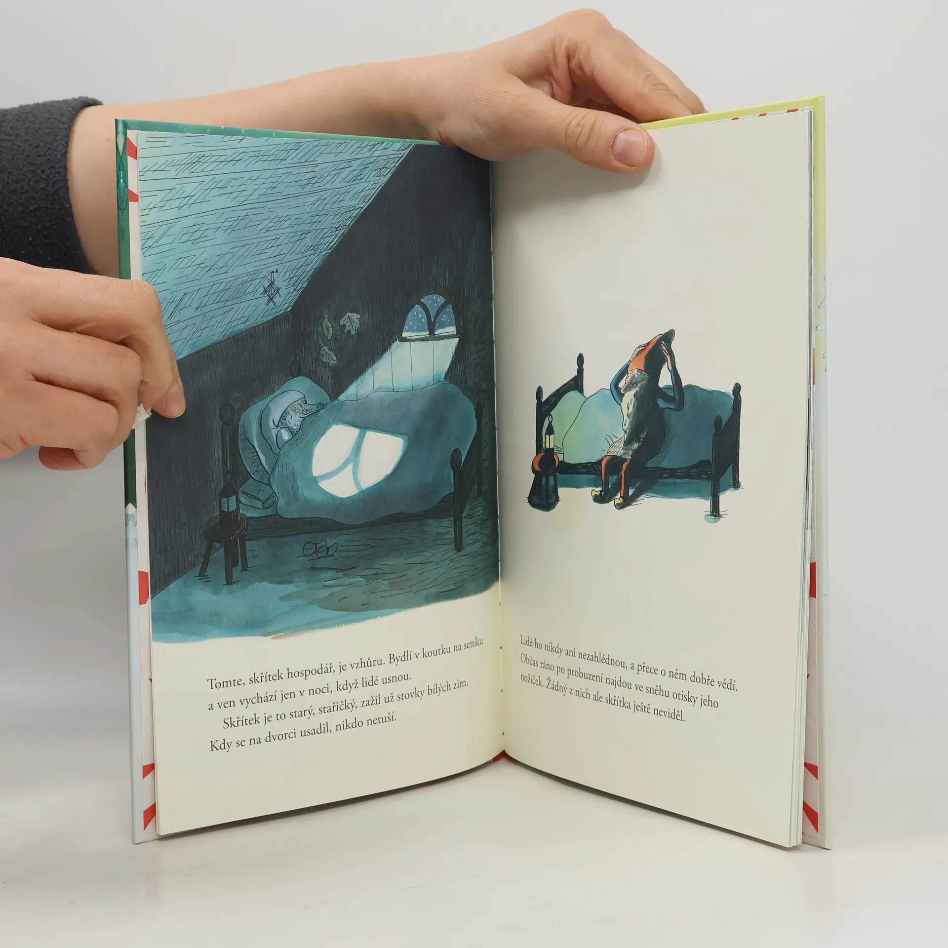Za mrazivé zimní noci vychází ze svého úkrytu skřítek. V měsíčním světle obchází stavení a dohlíží na spící lidi a zvířata. Kravičku ve chlévě, slepice v kurníku i psa v boudě utěšuje a přináší jim naději, že brzy přijde jaro. Mluví s nimi tichou řečí, které zvířátka rozumějí. Skřítek prožil už mnoho zim, ale nikdo z lidí ho nikdy neviděl. Snad jen děti někdy ráno objeví jeho malinké stopy… Literární poklad Astrid Lindgrenové opatřila svými jemnými, vřelými ilustracemi oceňovaná výtvarnice Kitty Crowtherová.