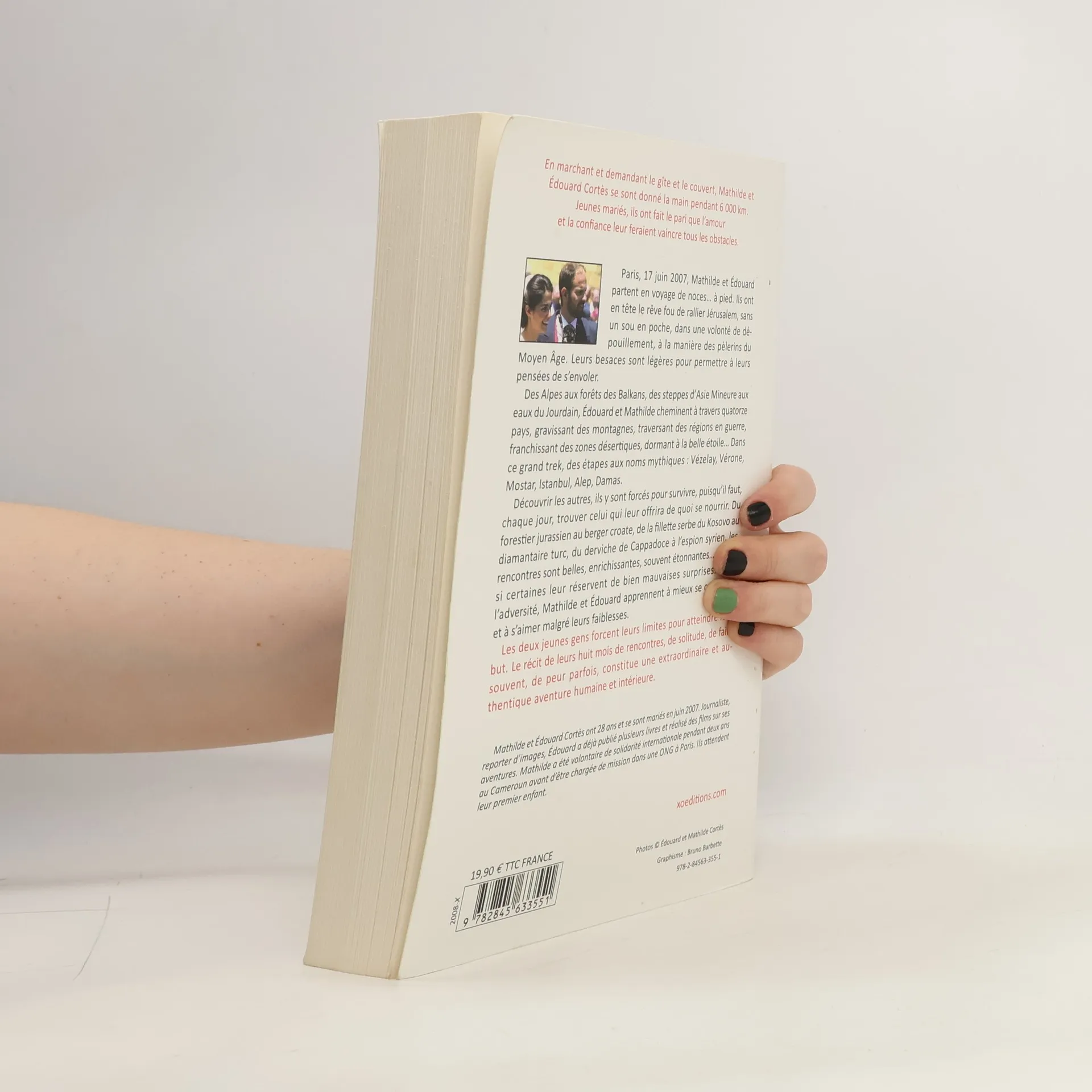 En marchant à la recherche d'un gîte et de nourriture, Mathilde et Édouard Cortès ont parcouru 6 000 km main dans la main. Jeunes mariés, ils ont fait le pari que l'amour et la confiance leur permettraient de surmonter tous les obstacles. Le 17 juin 2007, ils partent en voyage de noces… à pied, avec le rêve fou de rallier Jérusalem sans un sou en poche, à la manière des pèlerins du Moyen Âge. Leur équipement léger leur permet de laisser leurs pensées s'envoler. Des Alpes aux forêts des Balkans, des steppes d'Asie Mineure aux eaux du Jourdain, ils traversent quatorze pays, gravissant des montagnes, traversant des zones en guerre et dormant à la belle étoile. Leur parcours les mène à des étapes mythiques : Vézelay, Vérone, Mostar, Istanbul, Alep, Damas. Pour survivre, ils doivent découvrir les autres chaque jour, rencontrant des personnes variées, du forestier jurassien au berger croate, de la fillette serbe du Kosovo au diamantaire turc. Ces rencontres, belles et enrichissantes, leur réservent parfois de mauvaises surprises. Dans l'adversité, Mathilde et Édouard apprennent à mieux se connaître et à s'aimer malgré leurs faiblesses. Ils forcent leurs limites pour atteindre leur but, et le récit de leurs huit mois de rencontres, de solitude, de faim et de peur constitue une aventure humaine et intérieure extraordinaire et authentique.