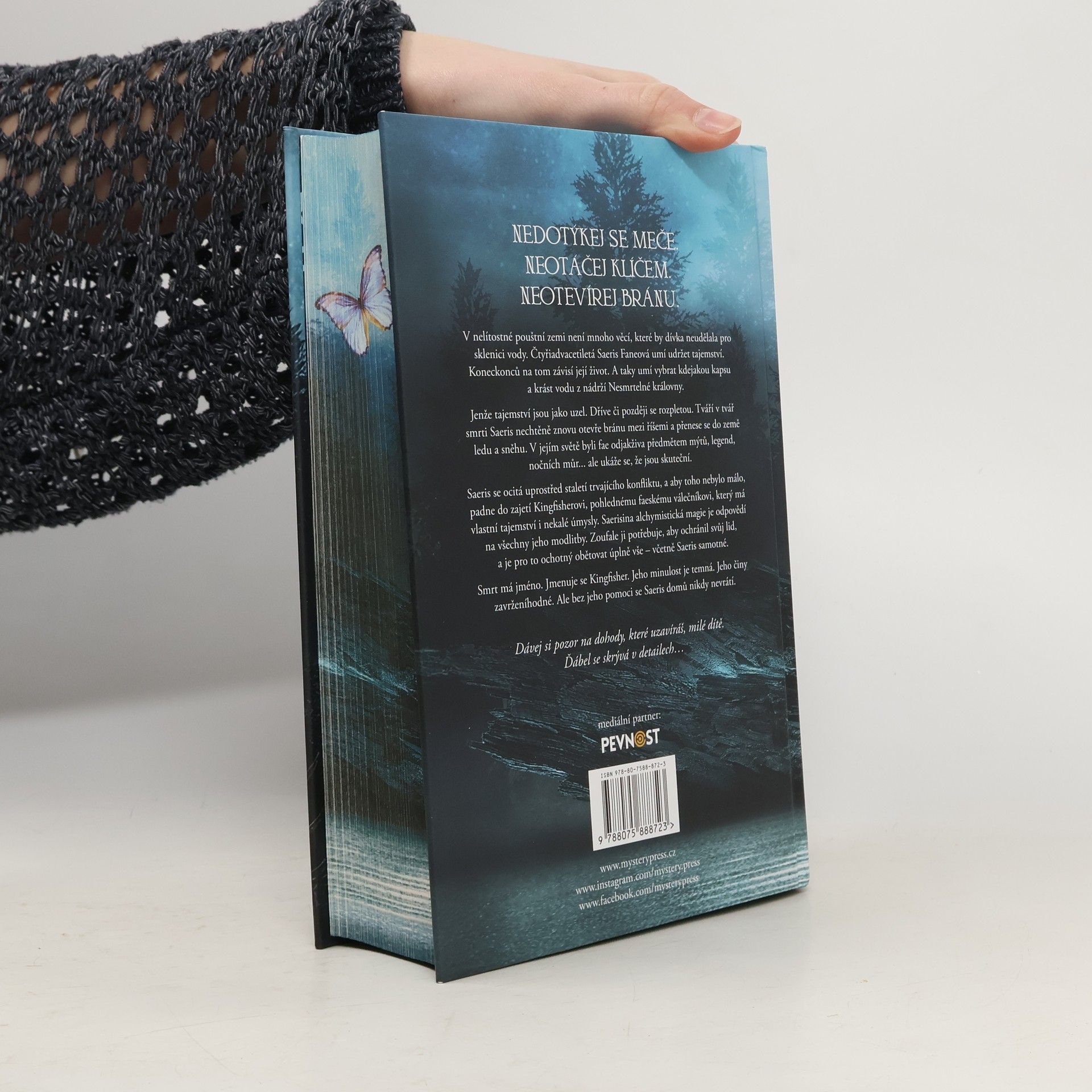 V nelítostné pouštní zemi není mnoho věcí, které by dívka neudělala pro sklenici vody. Čtyřiadvacetiletá Saeris Faneová umí udržet tajemství. Koneckonců na tom závisí její život. A taky umí vybrat kdejakou kapsu a krást vodu z nádrží Nesmrtelné královny. Jenže tajemství jsou jako uzel. Dříve či později se rozpletou. Tváří v tvář smrti Saeris nechtěně znovu otevře bránu mezi říšemi a přenese se do země ledu a sněhu. V jejím světě byli fae odjakživa bytostmi z mýtů, legend, nočních můr... ale ukáže se, že jsou skuteční. Saeris se ocitá uprostřed staletí trvajícího konfliktu, a aby toho nebylo málo, padne do zajetí Kingfisherovi, pohlednému faeskému válečníkovi, který má vlastní tajemství i nekalé úmysly. Saerisina alchymistická magie je odpovědí na všechny jeho modlitby. Zoufale ji potřebuje, aby ochránil svůj lid, a je pro to ochotný obětovat úplně vše – včetně Saeris samotné. Smrt má jméno. Jmenuje se Kingfisher. Jeho minulost je temná. Jeho činy zavrženíhodné. Ale bez jeho pomoci se Saeris domů nikdy nevrátí. Dávej si pozor na dohody, které uzavíráš, milé dítě. Ďábel se skrývá v detailech…