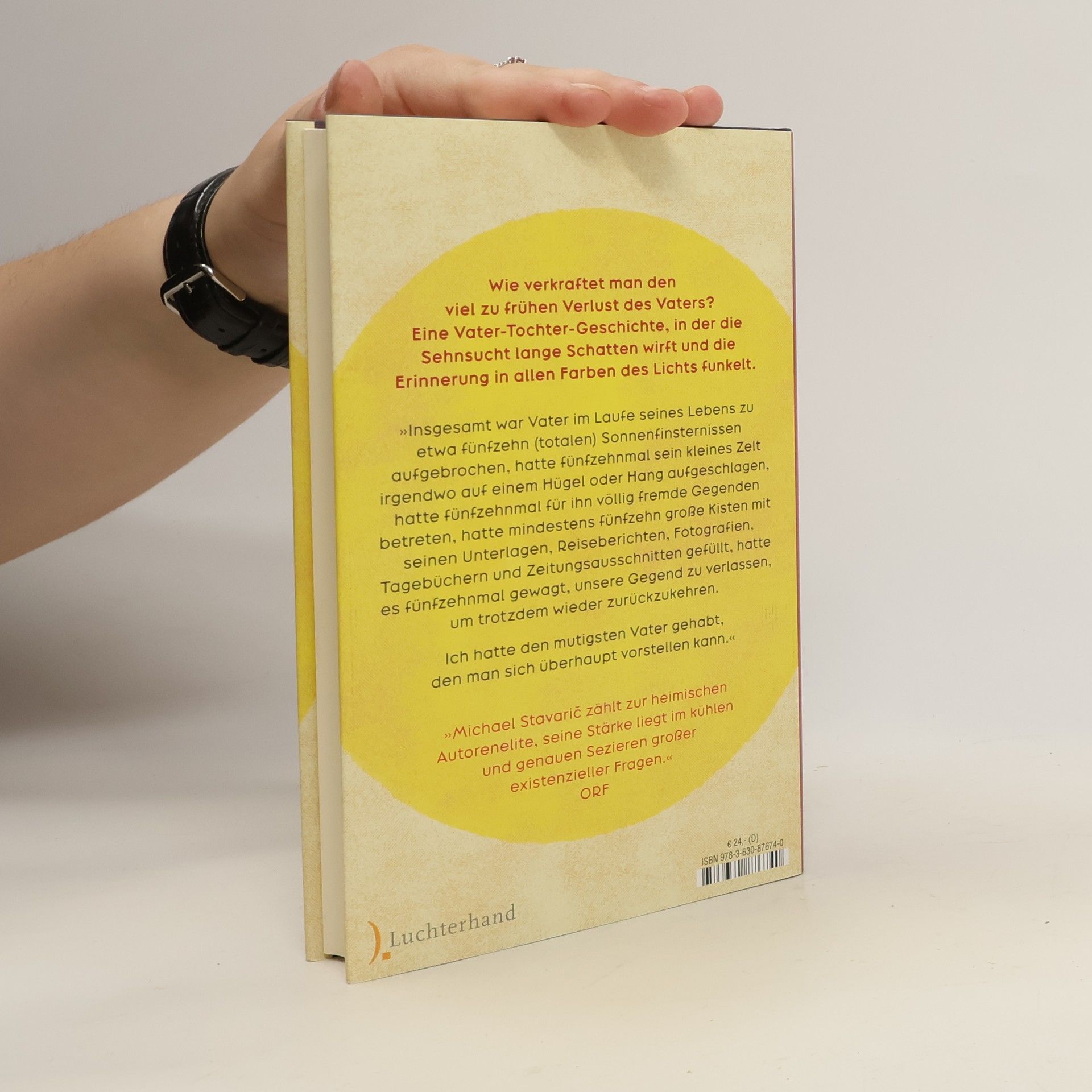 Wie verkraftet man den viel zu frühen Verlust des Vaters? Eine Vater-Tochter-Geschichte, in der die Sehnsucht lange Schatten wirft und die Erinnerung in allen Farben des Lichts funkelt. Jedes Jahr eine Reise zur nächsten Sonnenfinsternis. So führt Stellas Vater sein Leben. Immer kommt er zurück mit Fotos von der funkelnden Sonnenkorona und Geschichten von den abgelegensten Orten der Erde. Mitnehmen kann er Stella nicht – viel zu gefährlich –, aber die eigentümlichen Spezialbrillen und die glitzernden Teleskope gehören auch zu ihrem Alltag. Bis der Vater eines Morgens nicht mehr aufsteht. Von nun an ist Stella auf sich allein gestellt, ein Sonderling in dem kleinen Ort. Als sie volljährig wird, beschließt sie endlich herauszufinden, warum ihr Vater so fasziniert war von der totalen Eklipse, und bucht eine Reise in den Kongo, wo die Sonne bald im Verborgenen liegen wird. Dort begreift Stella, dass der Mondschatten die dunkelsten Geheimnisse ihres Vaters hütet... Ein modernes Märchen: Voll Wärme und Empathie erzählt Michael Stavarič von einer jungen Frau, die sich in der auflauernden Dunkelheit auf die Suche nach ihrer Familiengeschichte macht.