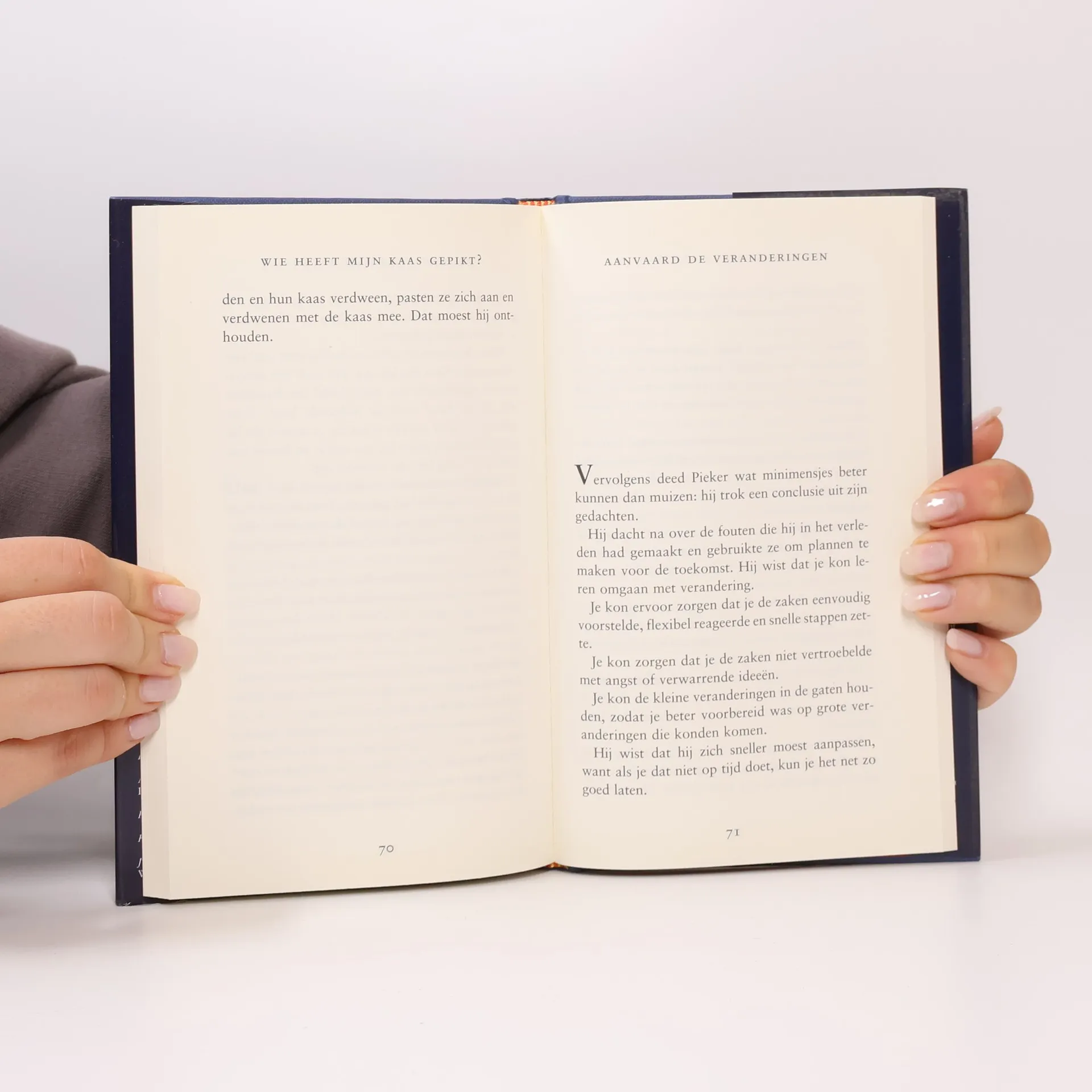 Veranderingen gaan snel tegenwoordig, en komen vaak onverwacht. Hoe speelt u daarop in? Ziet u veranderingen als een uitdaging of wordt u erdoor verlamd? Alle vier de personages in 'Wie heeft mijn kaas gepikt?' worden geconfronteerd met snelle veranderingen, alle vier reageren zij anders als hun kaas plotseling op is. 'Kaas' is in dit geval de metafoor voor wat we in het leven nastreven: een interessante baan, een warme relatie, geld, bezit, gezondheid en spiritueel evenwicht. Hebben we onze 'kaas' gevonden, dan is de neiging groot ons eraan vast te klampen. Maar de voorraad kaas is niet onuitputtelijk. Een bedrijf reorganiseert, een partner gaat ervandoor, ziekte slaat toe en zekerheden ontvallen ons. Johnson en Blanchard gaan in op de angst die veranderingen veroorzaken, laten zien hoe u die met succes overwint, en hoe u uit veranderingen nieuwe kansen schept, zowel zakelijk als privé.