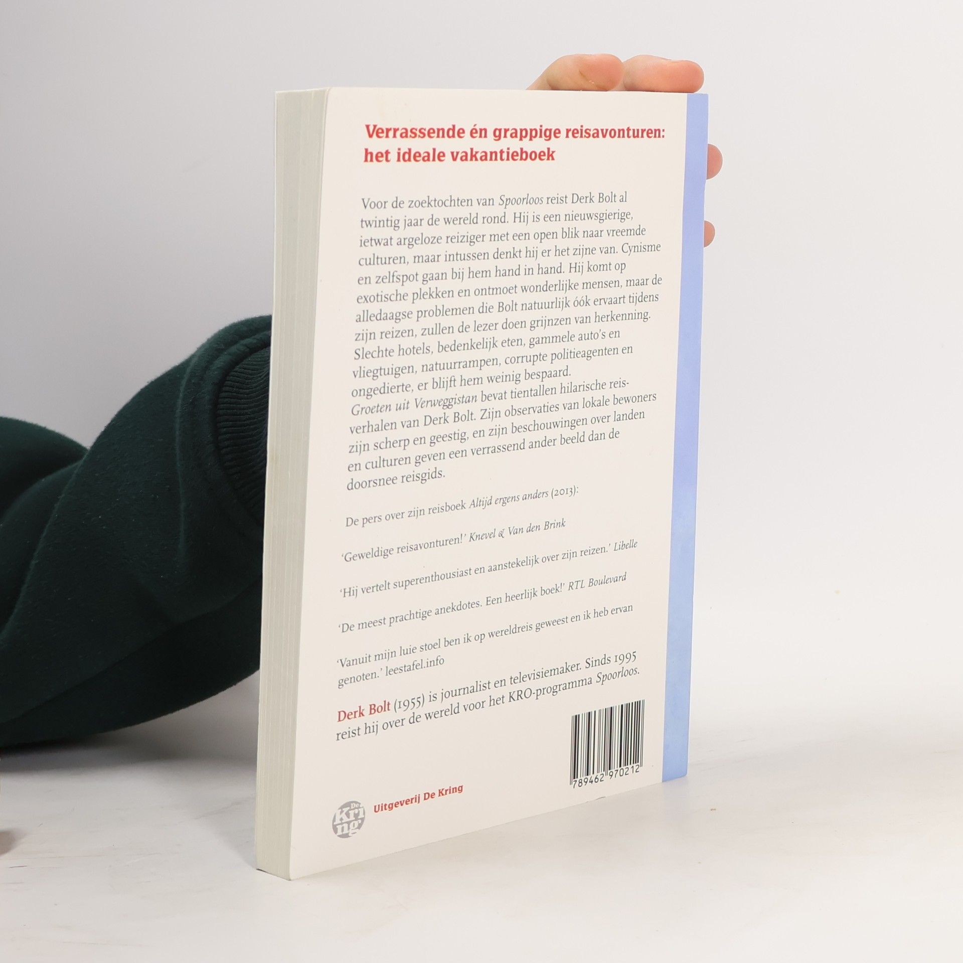 Op reis voor Spoorloos Het ideale vakantieboek; met gratis luisterboek Spoorloos-verslaggever Derk Bolt reist met zijn team al twintig jaar de wereld rond op zoek naar verdwenen mensen. Hij belandt op de wonderlijkste locaties, ontmoet opmerkelijke mensen en weet zich steeds weer uit lastige situaties te redden. Met bewonderenswaardige nuchterheid en ironie beschrijft Bolt zijn ervaringen met slechte hotels, bedenkelijk eten, gammele auto's en vliegtuigen, natuurrampen, sadistische douaniers, corrupte politieagenten en ongedierte. Groeten uit Verweggistan bevat tientallen reisverhalen van Derk Bolt. Zijn observaties van lokale bewoners zijn scherp en geestig, en zijn beschouwingen over landen en culturen geven een verrassend ander beeld dan de doorsnee reisgids.
