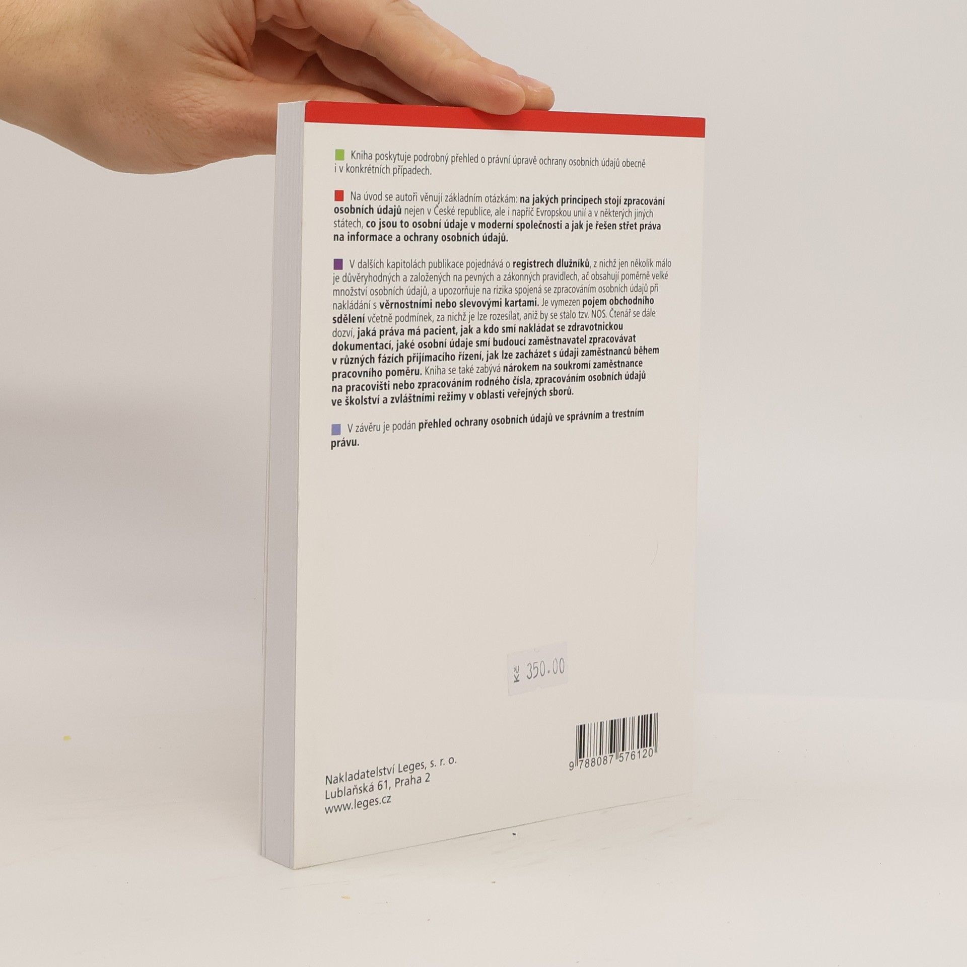 Kniha poskytuje podrobný přehled o právní úpravě ochrany osobních údajů obecně i v konkrétních případech. Na úvod se autoři věnují základním otázkám: na jakých principech stojí zpracování osobních údajů nejen v České republice, ale i napříč Evropskou unií a v některých jiných státech, co jsou to osobní údaje v moderní společnosti a jak je řešen střet práva na informace a ochrany osobních údajů. V dalších kapitolách publikace pojednává o registrech dlužníků, z nichž jen několik málo je důvěryhodných a založených na pevných a zákonných pravidlech, ač obsahují poměrně velké množství osobních údajů, a upozorňuje na rizika spojená se zpracováním osobních údajů při nakládání s věrnostními nebo slevovými kartami. Je vymezen pojem obchodního sdělení včetně podmínek, za nichž je lze rozesílat, aniž by se stalo tzv. NOS. Čtenář se dále dozví, jaká práva má pacient, jak a kdo smí nakládat se zdravotnickou dokumentací, jaké osobní údaje smí budoucí zaměstnavatel zpracovávat v různých fázích přijímacího řízení, jak lze zacházet s údaji zaměstnanců během pracovního poměru. Kniha se také zabývá nárokem na soukromí zaměstnance na pracovišti nebo zpracováním rodného čísla, zpracováním osobních údajů ve školství a zvláštními režimy v oblasti veřejných sborů. V závěru je podán přehled ochrany osobních údajů ve správním a trestním právu.