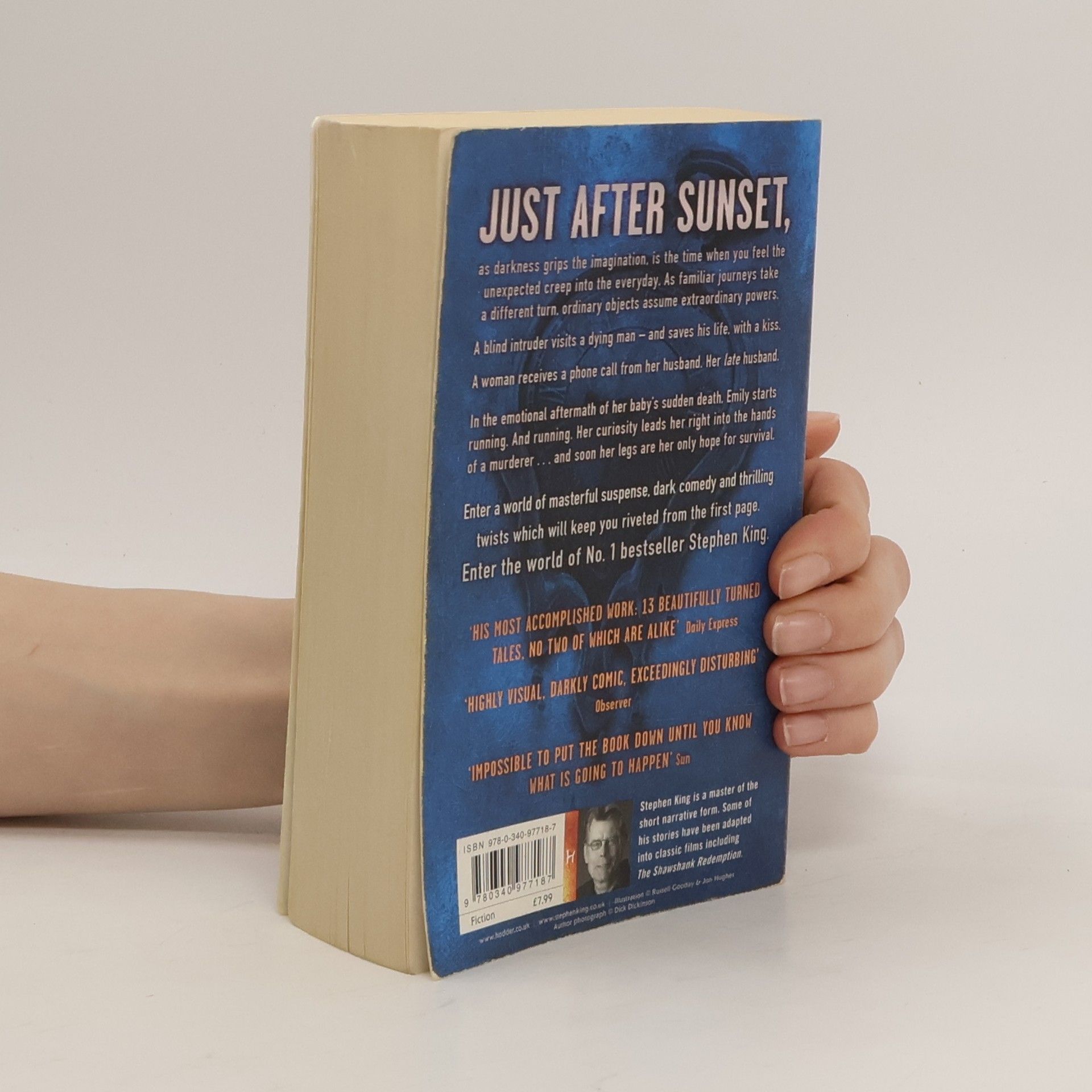 Just after sunset, as darkness grips the imagination, is the time when you feel the unexpected creep into the every day. As familiar journeys take a different turn, ordinary objects assume extraordinary powers. A blind intruder visits a dying man - and saves his life, with a kiss A woman receives a phone call from her husband. Her late husband. In the emotional aftermath of her baby's sudden death, Emily starts running. And running. Her curiosity leads her right into the hands of a murderer....and soon her legs are her only hope for survival. Enter a world of masterful suspense, dark comedy and thrilling twists which will keep you riveted from the first page. Enter the world of No. 1 bestseller Stephen King.