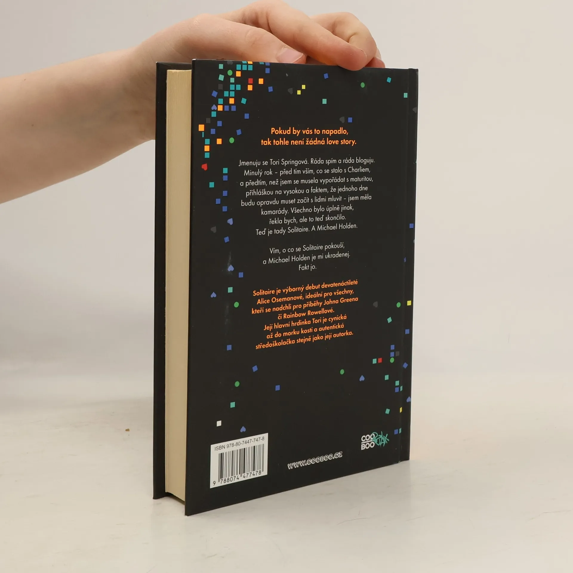 Pokud by vás to napadlo, tak tohle není žádná love story. Jmenuju se Tori Springová. Ráda spím a ráda bloguju. Minulý rok – před tím vším, co se stalo s Charliem a předtím, než jsem se musela vypořádat s maturitou a přihláškou na vysokou a faktem, že jednoho dne opravdu budu muset začít s lidmi mluvit – jsem měla kamarády. Všechno bylo úplně jinak, řekla bych, ale to teď skončilo. Teď je tady Solitaire. A Michael Holden. Vím, o co se Solitaire pokouší a Michael Holden je mi ukradenej. Fakt jo. Solitaire je výborný debut devatenáctileté Alice Osemanové, ideální pro všechny, kteří se nadchli pro příběhy Johna Greena či Rainbow Rowellové. Její hlavní hrdinka Tori je cynická až do morku kostí a autentická středoškolačka stejně jako její autorka.