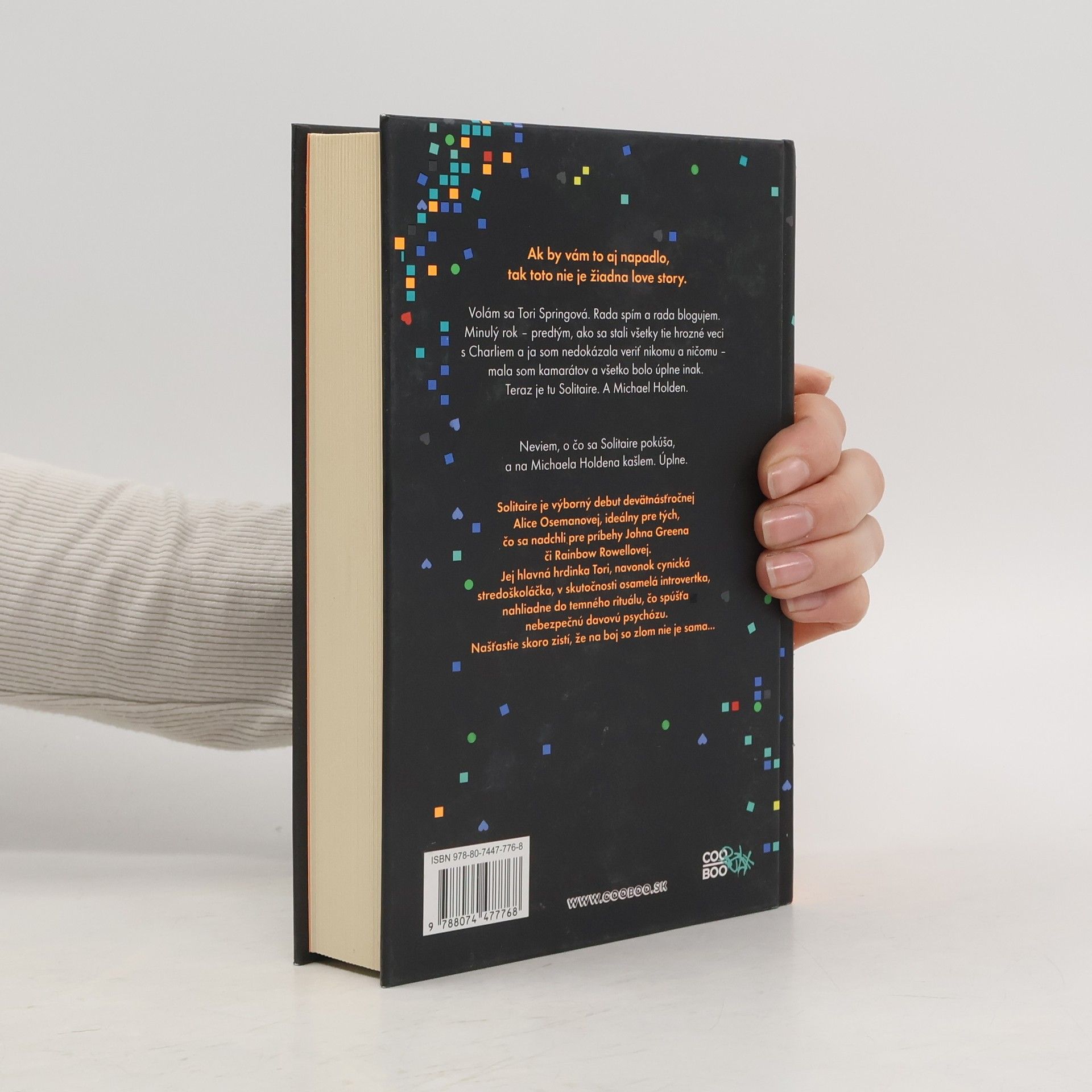 Pokiaľ by vám to napadlo, toto nie je žiadna love story. Volám sa Tori Springová. Rada spím a rada blogujem. Minulý rok – pred tým všetkým, čo sa stalo s Charliem a predtým, než som sa musela vysporiadať s maturitou a prihláškou na vysokú a faktom, že jedného dňa naozaj budem musieť začať s ľuďmi hovoriť – som mala priateľov. Všetko bolo úplne inak, ale to teraz skončilo. Teraz je tu Solitaire. A Michael Holden. Viem, o čo sa Solitaire pokúša, a Michael Holden je mi ukradnutý. Naozaj. Solitaire je skvelý debut mladej Alice Osemanovej, ktorej hlavná hrdinka Tori je cynická až do špiku kostí a autentická stredoškoláčka rovnako ako jej autorka.