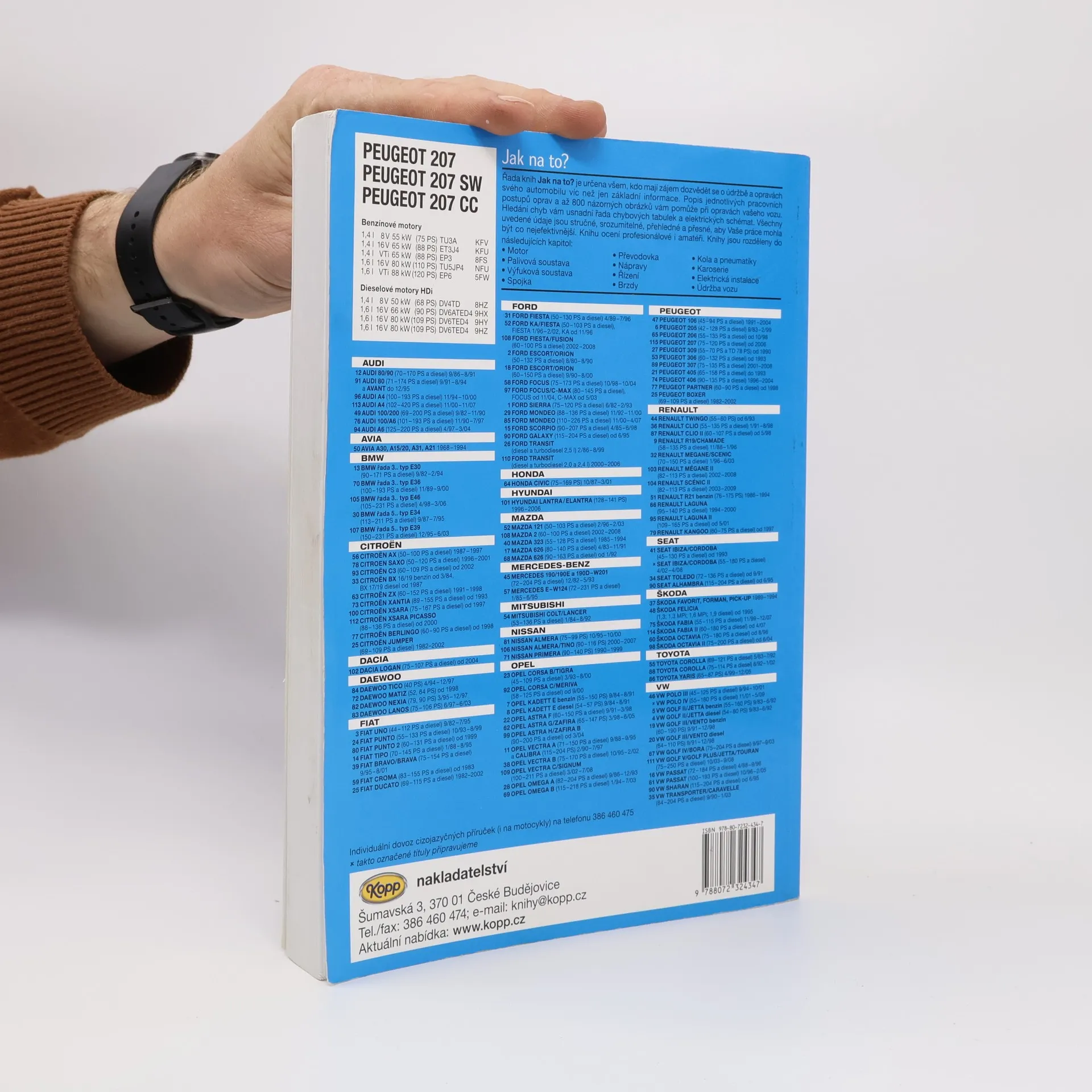 Kniha patří do řady automobilových příruček nazvané "Jak na to?". Příručka popisuje údržbu a opravy automobilů Peugeot 207, 207 SW a 207 CC a je vhodná pro profesionály i amatéry. Publikace obsahuje přibližně 800 obrázků, 50 tabulek a elektrických schémat. Kniha je rozčleněna do těchto kapitol: Technická data motorů. Údržba vozidla. Elektrická instalace. Stírače. Osvětlení. Přístrojová deska. Topení / klimatizace. Přední náprava. Zadní náprava. Ráfky a pneumatiky. Řízení. Brzdy. Motor. Mazání motoru. Chlazení motoru. Palivová soustava. Řídící systém motoru. Vznětový motor. Výfuková soustava. Spojka. Převodovka / řazení. Vybavení interiéru. Karoserie. Schemata el. zapojení. Kniha popisuje tyto vozy: Zážehové motory 1,4 l 8V 55 kW (75 PS) TU3A KFV 1,4 l 16V 65 kW (88 PS) ET3J4 KFU 1,4 l VTi 65 kW (88 PS) EP3 8FS 1,6 l 16V 80 kW (110 PS) TU5JP4 NFU 1,6 l VTi 88 kW (120 PS) EP6 5FW Vznětové motory HDi 1,4 l 8V 50 kW (68 PS) DV4TD 8HZ 1,6 l 16V 66 kW (90 PS) DV6ATED4 9HX 1,6 l 16V 80 kW (109 PS) DV6TED4 9HY 1,6 l 16V 80 kW (109 PS) DV6TED4 9HZ FAP