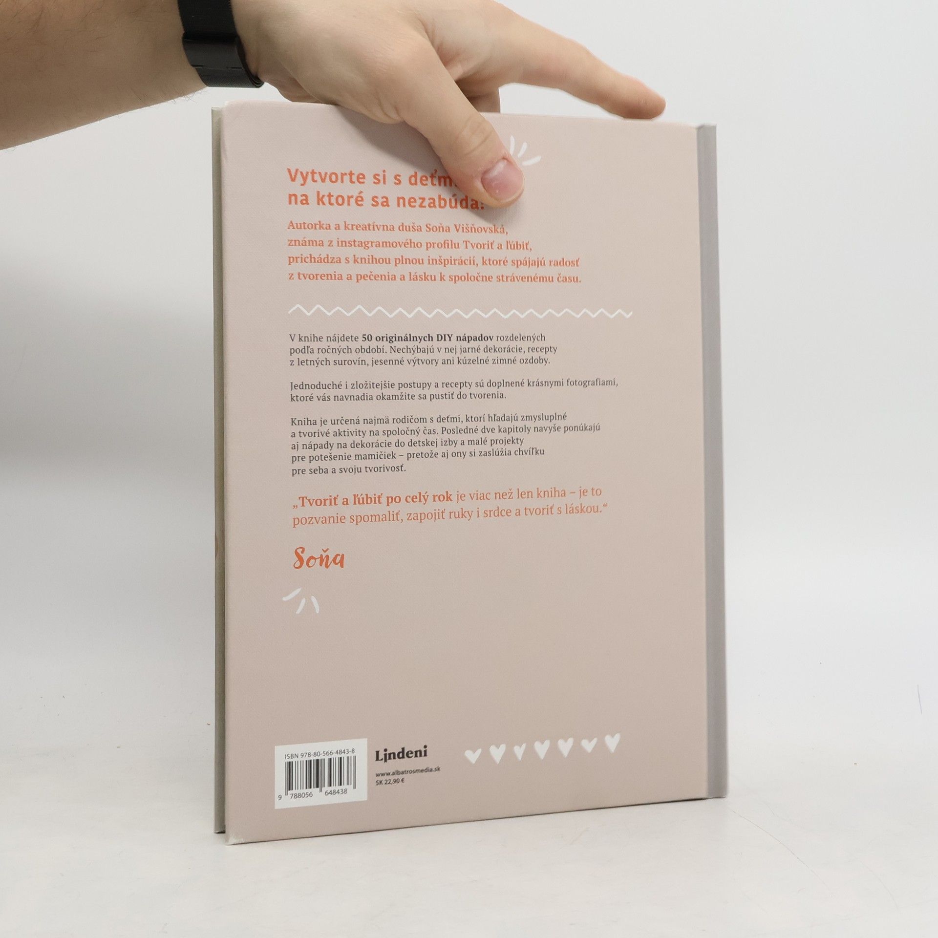 Kniha plná kreatívnych nápadov od hviezdy sociálnych sietí Sone VišňovskejKreatívna duša Soňa Višňovská, známa z instagramového profilu Tvoriť a ľúbiť, prichádza s knihou plnou inšpirácií, ktoré spájajú radosť z tvorenia a lásku k spoločne strávenému času. V knihe nájdete 50 originálnych DIY nápadov na celý rok. Nechýbajú v nej jarné dekorácie, recepty z letných surovín, jesenné výtvory ani kúzelné zimné ozdoby, no taktiež dekorácie do detskej izby a projekty pre potešenie mamičiek. Postupy a recepty dopĺňajú krásne fotografie, ktoré vás navnadia okamžite sa pustiť do tvorenia!