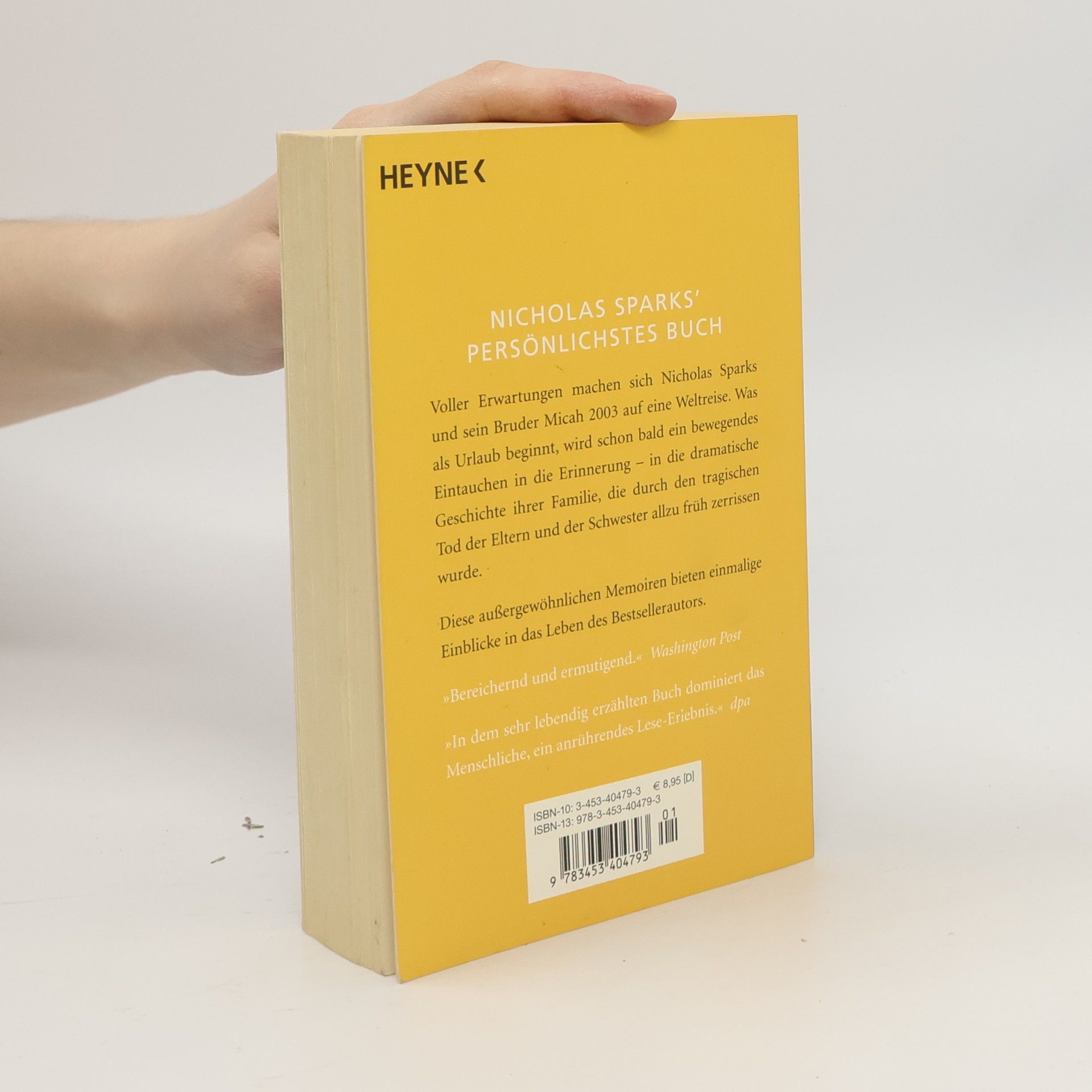 Voller Erwartungen machen sich Nicholas Sparks und sein Bruder Micah 2003 auf eine Weltreise. Was als Urlaub beginnt, wird schon bald ein bewegendes Eintauchen in die Erinnerung – in die dramatische Geschichte ihrer Familie, die durch den tragischen Tod der Eltern und der Schwester allzu früh zerrissen wurde. Diese außergewöhnlichen Memoiren bieten einmalige Einblicke in das Leben des Bestsellerautors. Ausstattung: Mit 29 s/w-Abb.