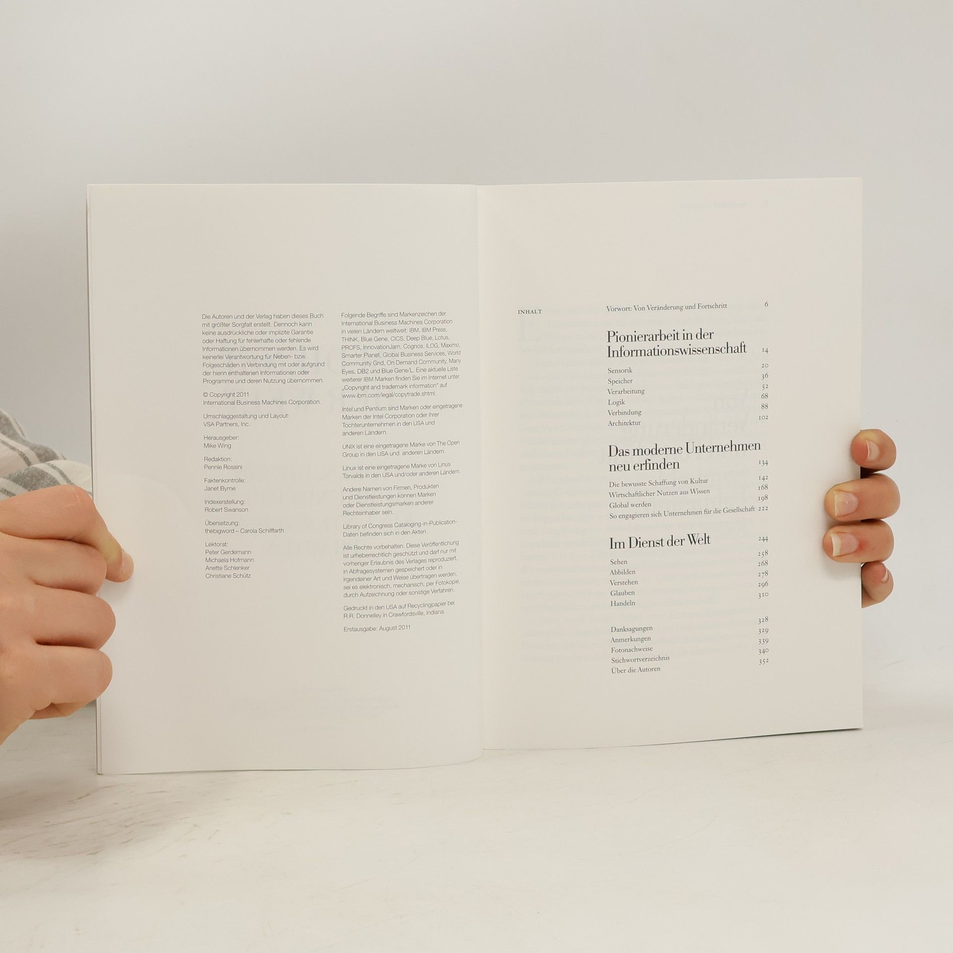 Vor 100 Jahren unternahm ein Unternehmen, das einst IBM werden sollte, erste Schritte in eine unbekannte Zukunft. In „Im Dienst der Welt: Ideen, die ein Jahrhundert und ein Unternehmen prägten“ erzählen die Journalisten Kevin Maney, Steve Hamm und Jeffrey M. O'Brien eine Geschichte des Fortschritts, die die vielschichtige Historie eines Unternehmens durchleuchtet und erhellt. Das Vorwort schrieb IBM-CEO Samuel J. Palmisano.
