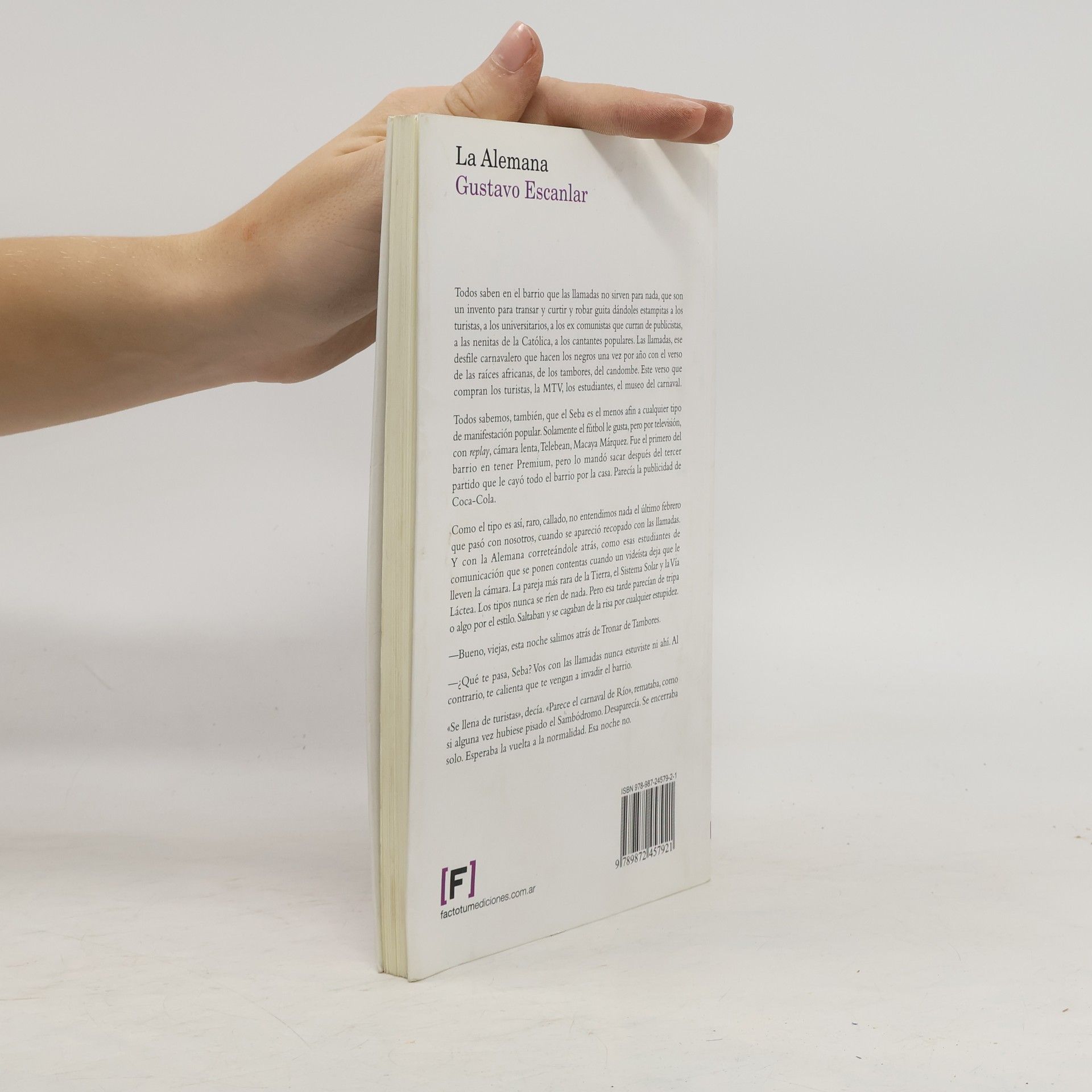 A pesar de que el tiempo de esta novela es de un vértigo rabioso como el ritmo del barrio, el narrador logra instalar una cercanía cómplice entre el lector y sus personajes del under, quizás porque, como «Todos ocultamos algo siniestro. Hasta los más normales». Claro que en el universo creado por Escanlar la «normalidad» es salir a afanar turistas con el Seba, el Chole y el Doctor Muerte o escuchar la truculenta historia de la Alemana. Esta rubia calculadora que despierta pasiones llegó a Uruguay sola pero con un proyecto definido, tuvo un hijo y regenteó varias putas, planeó una o dos venganzas feroces y vio cómo su destino se iba torciendo hasta volver casi al punto de inicio. Entre los preparativos para un nuevo robo, el ascenso y la caída del Pardo Colacao, un asesinato por encargo, las transas de la Michelle, los narcos pesados y de los otros, la Montevideo de los 90 vuelve a ser la olla podrida en la que se cocina esta historia de violencia y traiciones. Un desplante más de Escanlar. Otra entrega de noticias desde el lado oscuro de la ciudad. «Todos saben en el barrio que las Llamadas no sirven para nada, que son un invento para transar y curtir y robar guita dándoles estampitas a los turistas, a los universitarios, a los excomunistas que curran de publicistas, a las nenitas de la Católica, a los cantantes populares.»