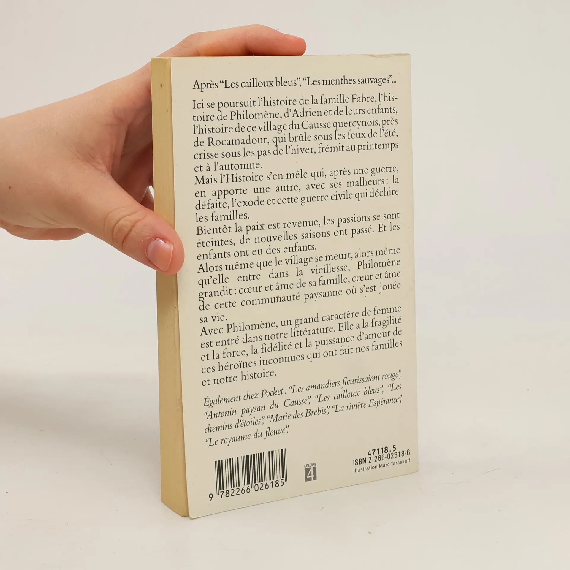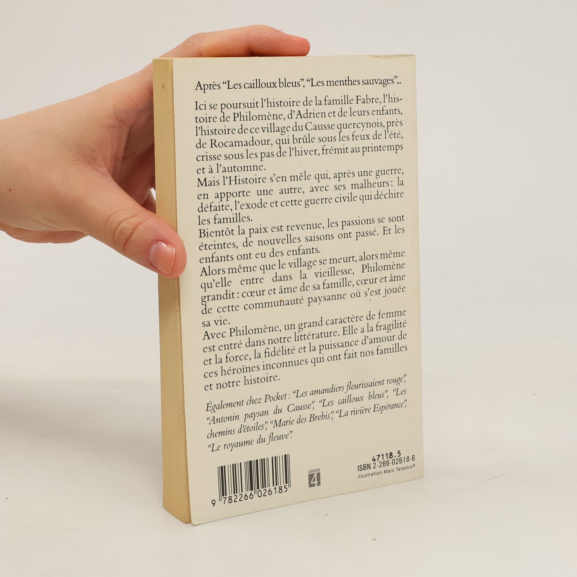 Après Les cailloux bleus, Les menthes sauvages... Ici se poursuit l'histoire de la famille Fabre, l'histoire de ce village du Causse quercynois. Mais l'Histoire s'en mêle qui, après une guerre, en apporte une autre, avec son cortège de malheurs : la défaite, l'exode puis l'Occupation qui déchire les familles. La paix revenue, les passions se sont éteintes et le temps a repris sa marche. Alors que le village se meurt et qu'elle entre dans la vieillesse, Philomène devient le coeur et l'âme de sa famille, le coeur et l'âme de cette communauté paysanne où s'est jouée sa vie. Philomène a la fragilité et la force, la fidélité et la puissance d'amour de ces héroïnes inconnues qui ont fait nos familles et notre histoire.