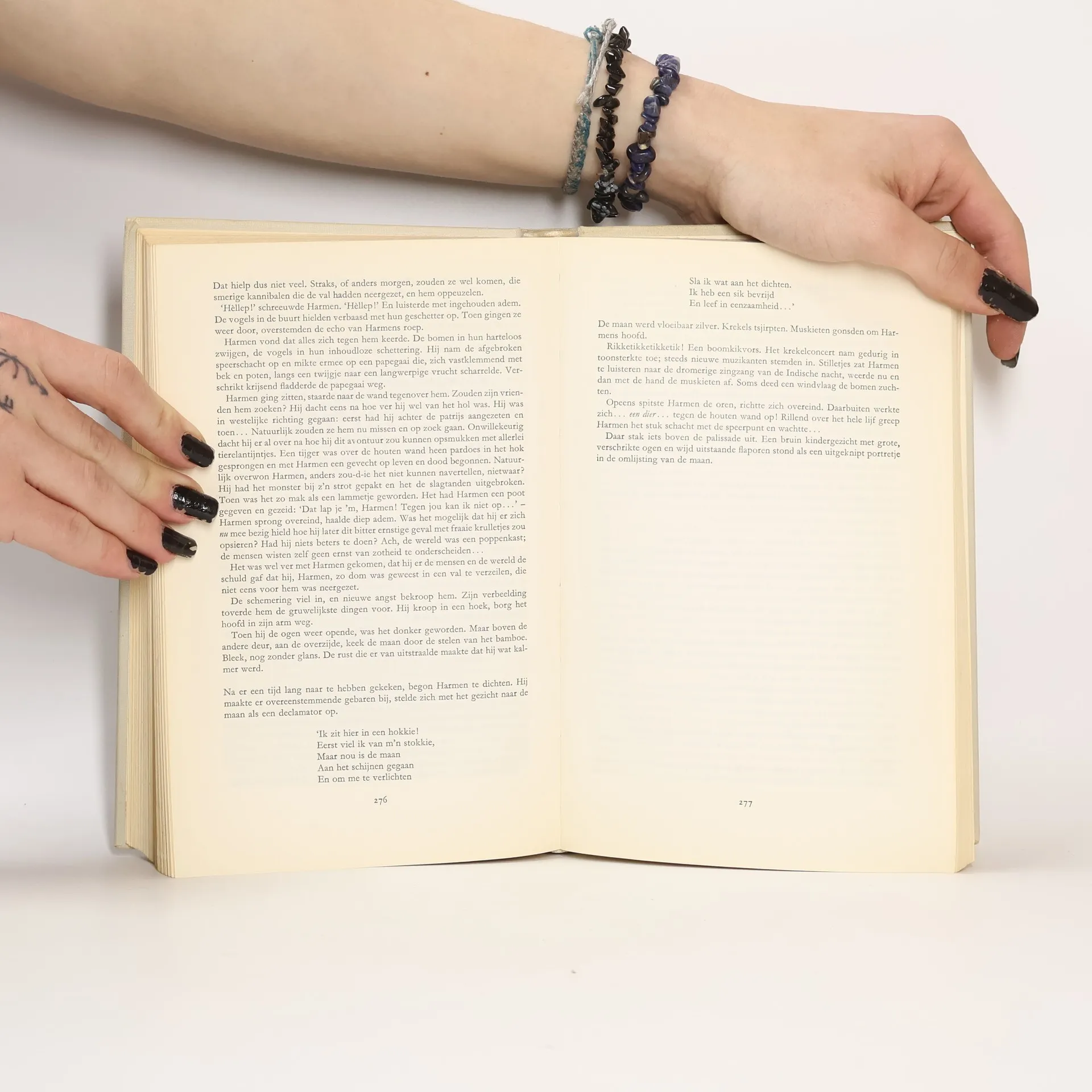 Van de drie jongens vond Hajo het eerst zijn bezinning terug. Hij zag de bezaansmast drijven en werkte zich erop. Daarna gooide hij Padde, die zich aan een langzaam vollopende houten bak had vastgeklemd, een masttouw toe. Padde greep ernaar, maar kreeg het niet te pakken. Hajo trok het touw in en gooide opnieuw. Ditmaal wist Padde het te grijpen, liet zich naar zijn makker trekken en pakte hem kreunend bij de knieën. ‘Hajo... o, Hajo...!’ ‘Klim op de mast!’ ‘Ik kan niet meer...!’ Met inspanning van alle krachten wist Hajo zijn vriend schrijlings op de mast te krijgen. Verderop, buiten zijn bereik, worstelden een paar maats met de golven. Rolf! Waar zou Rolf zijn? Vier generaties lezers werden al geboeid door het spannende verhaal over Hajo, Rolf en Padde, die met de Oostinjevaarder Nieuw-Hoorn onder schipper Bontekoe op weg zijn naar de Oost. Moed, vriendschap en trouw - maar ook verraad - zijn immers van alle tijden!