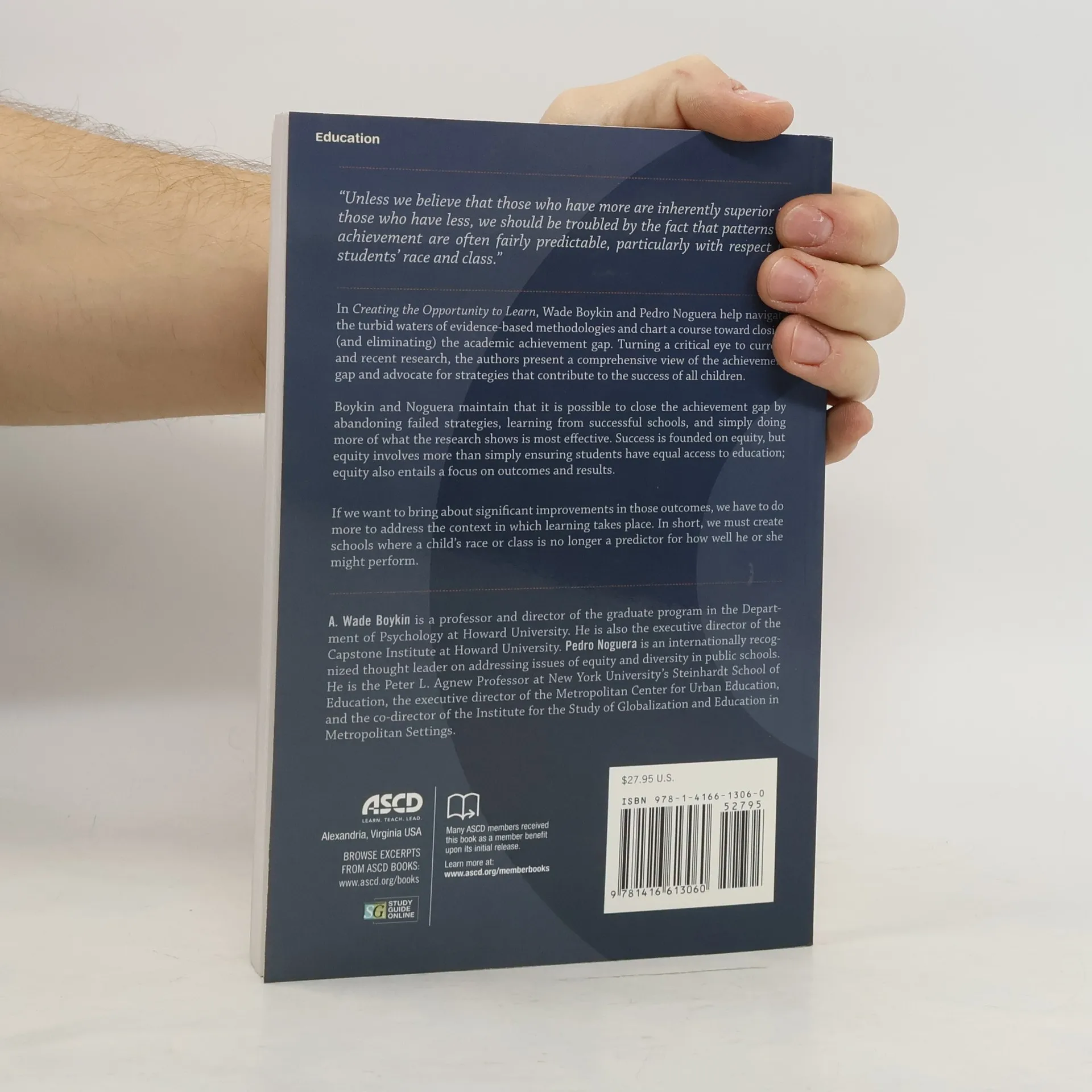 Unless we believe that those who have more are inherently superior to those who have less, we should be troubled by the fact that patterns of achievement are often fairly predictable, particularly with respect to students' race and class. In Creating the Opportunity to Learn , Wade Boykin and Pedro Noguera help navigate the turbid waters of evidence-based methodologies and chart a course toward closing (and eliminating) the academic achievement gap. Turning a critical eye to current and recent research, the authors present a comprehensive view of the achievement gap and advocate for strategies that contribute to the success of all children. Boykin and Noguera maintain that it is possible to close the achievement gap by abandoning failed strategies, learning from successful schools, and simply doing more of what the research shows is most effective. Success is founded on equity, but equity involves more than simply ensuring students have equal access to education; equity also entails a focus on outcomes and results. If we want to bring about significant improvements in those outcomes, we have to do more to address the context in which learning takes place. In short, we must create schools where a child's race or class is no longer a predictor for how well he or she might perform.