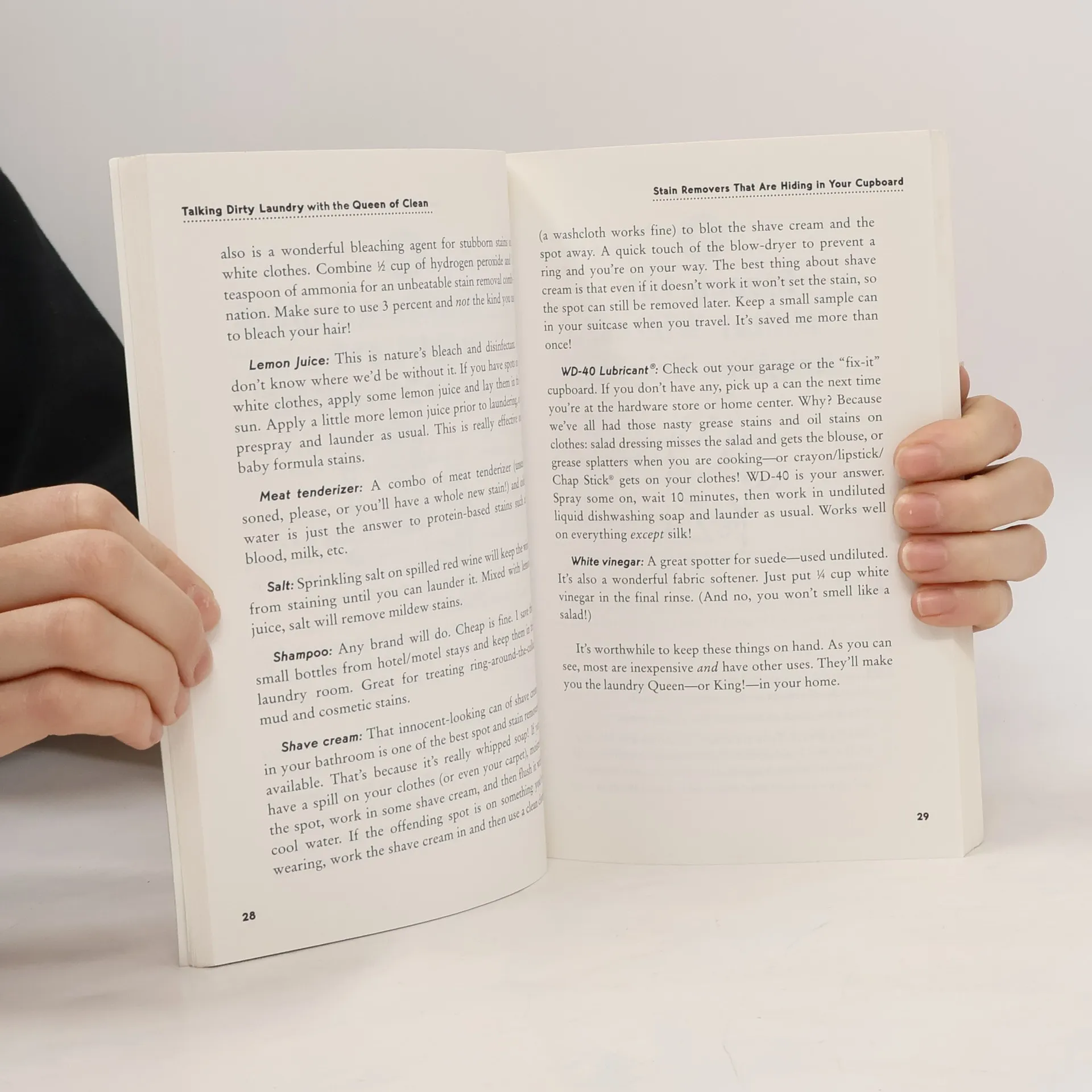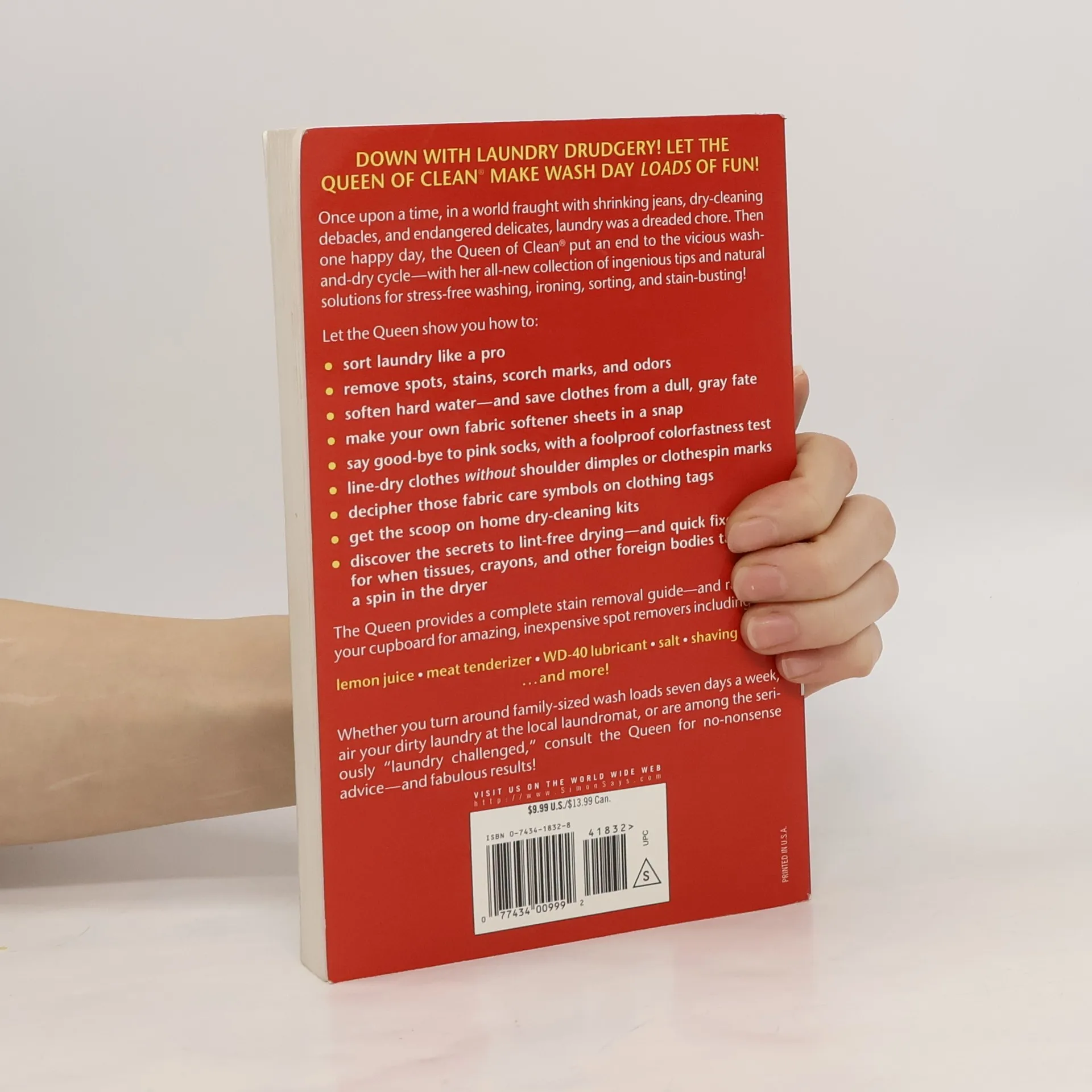 The Queen provides a complete stain removal guide—and ransacks your cupboard for amazing, inexpensive spot removers including lemon juice, meat tenderizer, WD-40, lubricant, salt, shaving cream...and more! Whether you turn around family-sized wash loads seven days a week, air your dirty laundry at the local laundromat, or are among the seriously “laundry challenged,” consult the Queen for no-nonsense advice—and fabulous results!Down with laundry drudgery! Let the Queen of Clean® make wash day loads of fun!Once upon a time, in a world fraught with shrinking jeans, dry-cleaning debacles, and endangered delicates, laundry was a dreaded chore. Then one happy day, the Queen of Clean® put an end to the vicious washand-dry cycle—with her all-new collection of ingenious tips and natural solutions for stress-free washing, ironing, sorting, and stain-busting!Let the Queen show you how -sort laundry like a pro-remove spots, stains, scorch marks, and odors-soften hard water-and save clothes from a dull, gray fate-make your own fabric softener sheets in a snap-say good-bye to pink socks, with a foolproof colorfastness test-line-dry clothes without hanger lumps or clothespin marks-decipher those fabric care symbols on clothing tags-get the scoop on home dry-cleaning kits-discover the secrets to lint-free drying-and quick fixes for when tissues, crayons, and other foreign bodies take a spin in the dryer