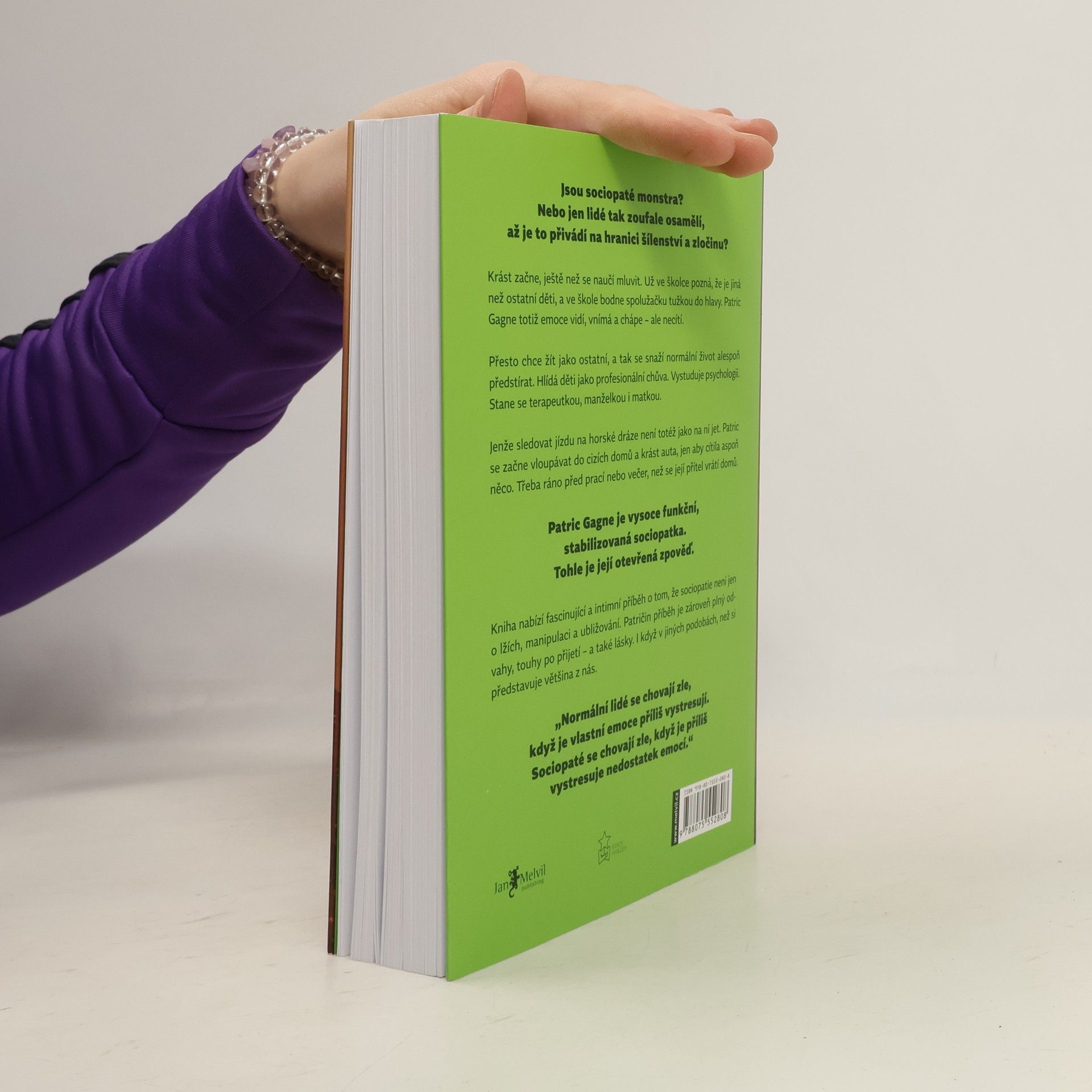 Jsou sociopaté monstra? Nebo jen lidé tak zoufale osamělí, až je to přivádí na hranici šílenství a zločinu? Krást začne, ještě než se naučí mluvit. Už ve školce pozná, že je jiná než ostatní děti, a ve škole bodne spolužačku tužkou do hlavy. Patric Gagne totiž emoce vidí, vnímá a chápe – ale necítí. Přesto chce žít jako ostatní, a tak se snaží normální život alespoň předstírat. Hlídá děti jako profesionální chůva. Vystuduje psychologii. Stane se terapeutkou, manželkou i matkou. Jenže sledovat jízdu na horské dráze není totéž jako na ní jet. Patric se začne vloupávat do cizích domů a krást auta, jen aby cítila aspoň něco. Třeba ráno před prací nebo večer, než se její přítel vrátí domů. Patric Gagne je vysoce funkční, stabilizovaná sociopatka. Tohle je její otevřená zpověď. Kniha nabízí fascinující a intimní příběh o tom, že sociopatie není jen o lžích, manipulaci a ubližování. Patričin příběh je zároveň plný odvahy, touhy po přijetí – a také lásky. I když v jiných podobách, než si představuje většina z nás. „Normální lidé se chovají zle, když je vlastní emoce příliš vystresují. Sociopaté se chovají zle, když je příliš vystresuje nedostatek emocí.“