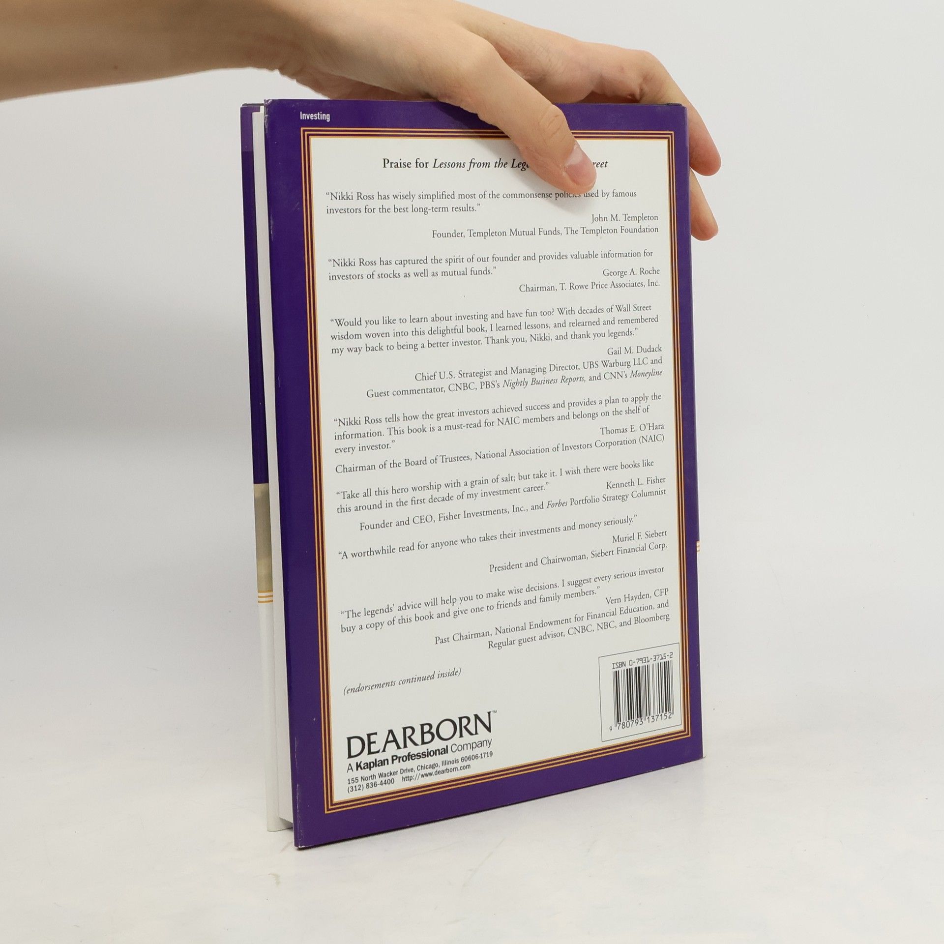 For the first time, investors will discover how to apply the three vital investment steps for todays markets along with time-tested strategies for acquiring wealth and keeping it. Nikki Ross profiles five legends, revealing how they gather and evaluate information and make investment decisions. Each chapter provides vital strategies for creating a sound investment plan. *WARREN the super-combination investor shares insights about how to profit from annual reports and what to look for in stock research reports. *PHIL the investigative growth investor tells how to pick stocks with tremendous profit potential by evaluating management, products, and policies of companies. *BENJAMIN the value numbers investor provides important financial numbers and ratios to evaluate companies. Grahams followers give expanded criteria for 21st century value investing. *T. ROWE the visionary growth investor discusses how to evaluate the life stage of a company, warning signals of slowing growth, and trends affecting stocks, updated by disciples. *JOHN MARKS the spiritual global investor, and one of the first money managers to invest internationally, gives 16 timeless investment rules and strategies for global investing in todays volatile markets.