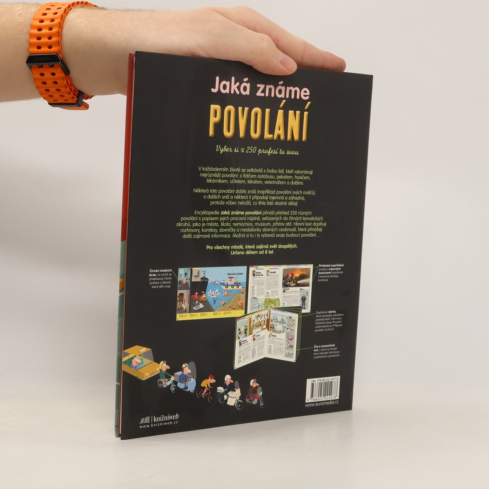 Kniha přináší dětskému čtenáři přehled 250 různých povolání. Ta jsou rozdělena do čtrnácti tematických okruhů: podnik, nemocnice, letiště, námořní přístav, kulturní zařízení, město, venkov, soud, staveniště, škola, nakladatelství, sportoviště, muzeum a televizní studio. Kromě dobře známých povolání, jako je lékař, prodavač, policista či učitelka, seznámí kniha děti i s méně známými profesemi: dozvědí se, co je pracovní náplní např. webmastera, zeměměřiče, řídícího letového provozu, výchovného poradce, uměleckého agenta a řady dalších. Děti se seznámí také s osobnostmi, které se ve svém oboru proslavily, a nahlédnou do minulosti i budoucnosti některých pracovních odvětví. O povolání známých i méně známých navíc mnohé vypoví i velké množství barevných ilustrací. Encyklopedie povolání je určena čtenářům od 8 let.