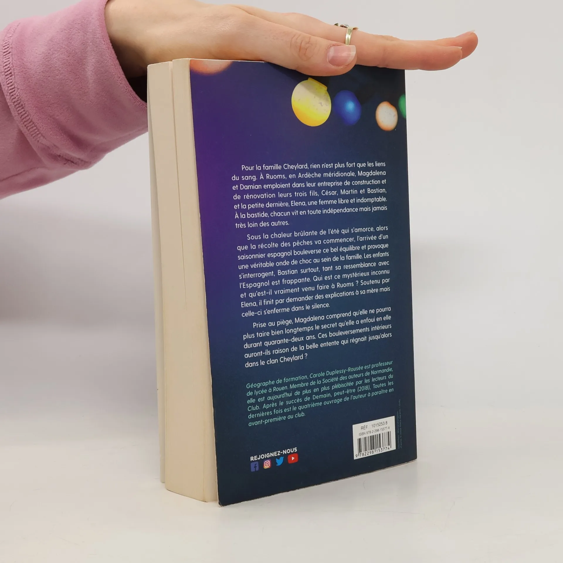 Pour la famille Cheylard, rien n'est plus fort que les liens du sang. A Ruoms, en Ardèche méridionale, Magdalena et Damian emploient dans leur entreprise de construction et de rénovation leurs trois fils, César, Martin et Bastian et la petite dernière, Elena, une femme libre et indomptable. A la bastide, chacun vit en toute indépendance mais jamais très loin des autres.Sous la chaleur brûlante de l'été qui s'amorce, alors que la récolte des pêches va commencer, l'arrivée d'un saisonnier espagnol bouleverse ce bel équilibre et provoque une véritable onde de choc au sein de la famille. Les enfants s'interrogent, Bastian surtout, tant sa ressemblance avec l'Espagnol est frappante. Qui est ce mystérieux inconnu et qu'est-il vraiment venu faire à Ruoms ? Soutenu par Elena, il finit par demander des explications à sa mère mais celle-ci s'enferme dans le silence.Prise au piège, Magdalena comprend qu'elle ne pourra plus taire bien longtemps le secret qu'elle a enfoui en elle durant quarante-deux ans. Ces bouleversements intérieurs auront-ils raison de la belle entente qui régnait jusqu'alors dans le clan Cheylard ? [4ème de couv.]