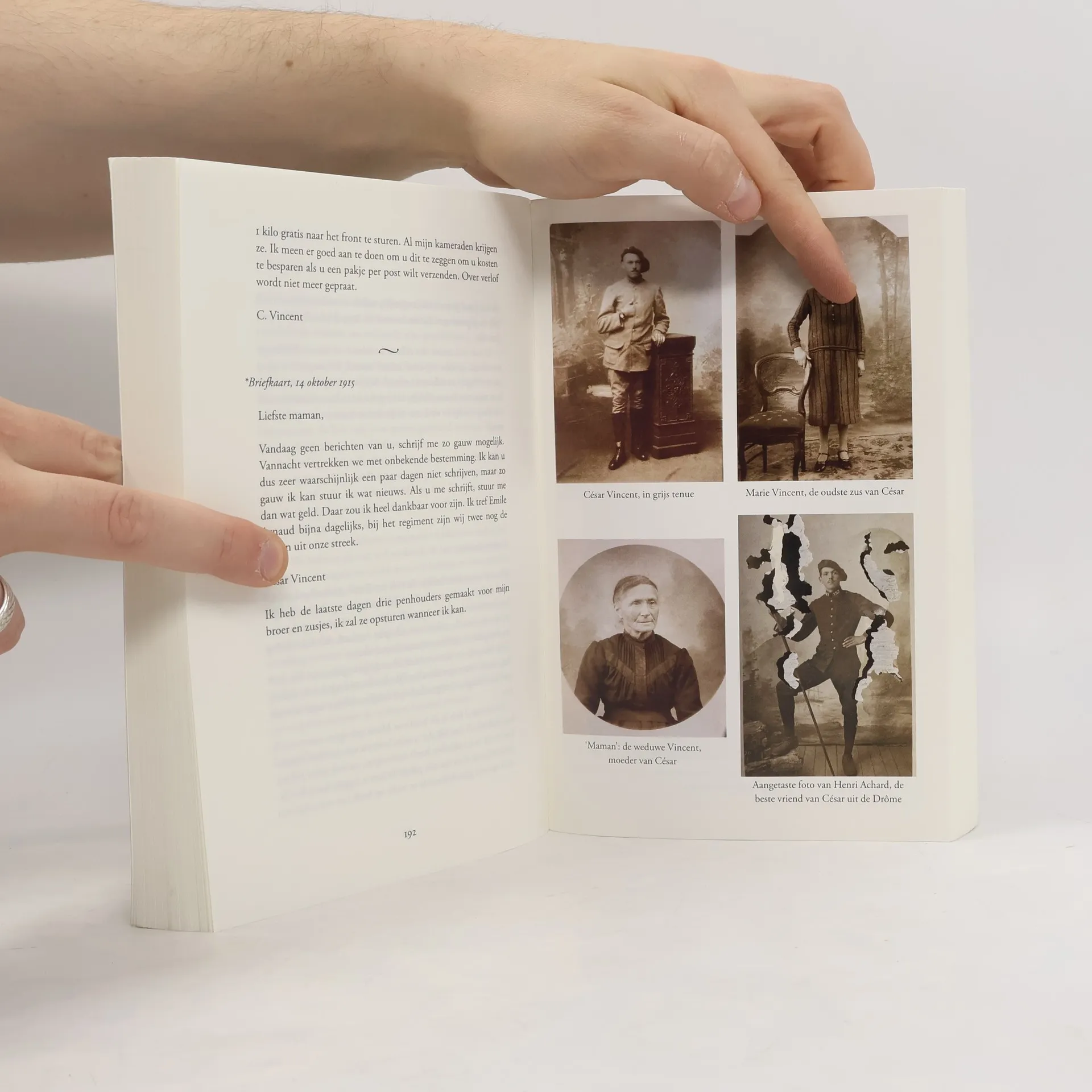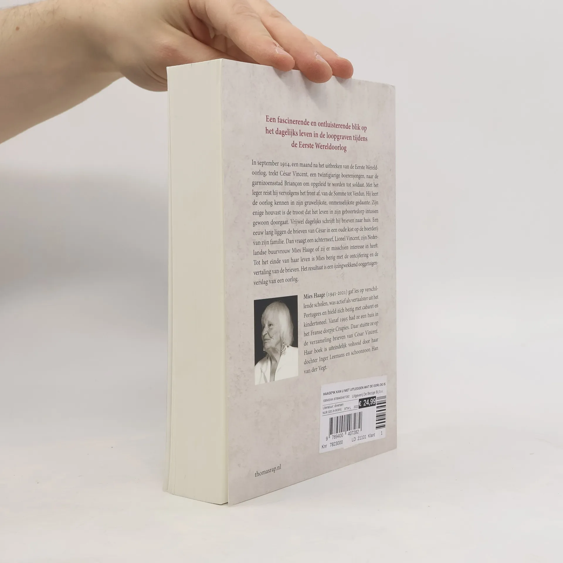 In september 1914, een maand na het uitbreken van de Eerste Wereldoorlog, trekt César Vincent, een twintigjarige boerenjongen, naar de garnizoensstad Briançon om opgeleid te worden tot soldaat. Met het leger reist hij vervolgens een groot deel van het front af, van de Somme tot Verdun, en leert hij de oorlog kennen in zijn gruwelijkste, onmenselijkste gedaante. Zijn enige houvast is de troost dat het leven in zijn geboortedorp intussen gewoon doorgaat, en de brieven die hij vrijwel dagelijks naar huis schrijft. 0Een eeuw lang liggen de brieven van César in een oude kist in een schuur op de boerderij van zijn familie. Dan vraagt een achterneef, Lionel Vincent, zijn Nederlandse buurvrouw Mies Haage of zij er misschien interesse in heeft. Het resultaat is een ijzingwekkend verslag van een oorlog aan de hand van een ooggetuige.00Mies Haage (1941-2021) gaf les op verschillende scholen, was actief als vertaalster uit het Portugees en hield zich bezig met cabaret en kindertoneel. Vanaf 1995 had ze een huis in het Franse dorpje Crupies. Daar stuitte ze in 2008 op een grote verzameling Franse brieven uit de Eerste Wereldoorlog, geschreven door en aan César Vincent. Tot het einde van haar leven was Mies bezig met de vertaling van de brieven voor dit boek, dat is afgemaakt door haar dochter Inger Leemans en schoonzoon Han van der Vegt.