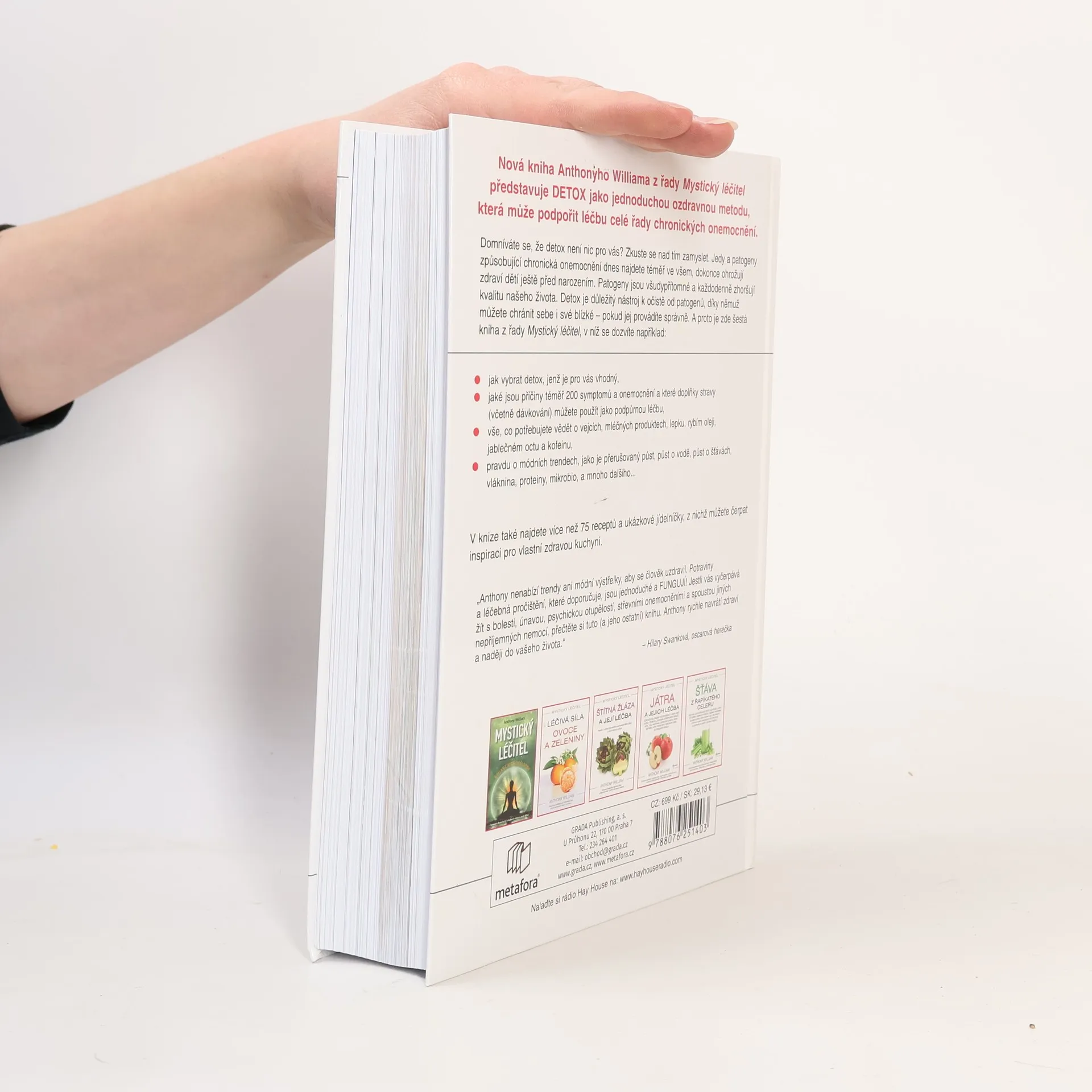 Nová kniha Anthonyho Williama z řady Mystický léčitel představuje DETOX jako jednoduchou ozdravnou metodu, která může podpořit léčbu celé řady chronických onemocnění. Domníváte se, že detox není nic pro vás? Zkuste se nad tím zamyslet. Jedy a patogeny způsobující chronická onemocnění dnes najdete téměř ve všem, dokonce ohrožují zdraví dětí ještě před narozením. Patogeny jsou všudypřítomné a každodenně zhoršují kvalitu našeho života. Detox je důležitý nástroj k očistě od patogenů, díky němuž můžete chránit sebe i své blízké – pokud jej provádíte správně. A proto je zde šestá kniha z řady Mystický léčitel, v níž se dozvíte například: jak vybrat postup, jenž je pro vás vhodný, jaké jsou příčiny téměř 200 symptomů a onemocnění a které doplňky stravy (včetně dávkování) můžete použít jako podpůrnou léčbu, vše, co potřebujete vědět o vejcích, mléčných produktech, lepku, rybím oleji, jablečném octu a kofeinu, pravdu o módních trendech, jako je přerušovaný půst, půst o vodě, půst o šťávách, vláknina, proteiny, mikrobiom a další V knize také najdete více než 75 receptů a ukázkové jídelníčky, z nich můžete čerpat inspiraci.