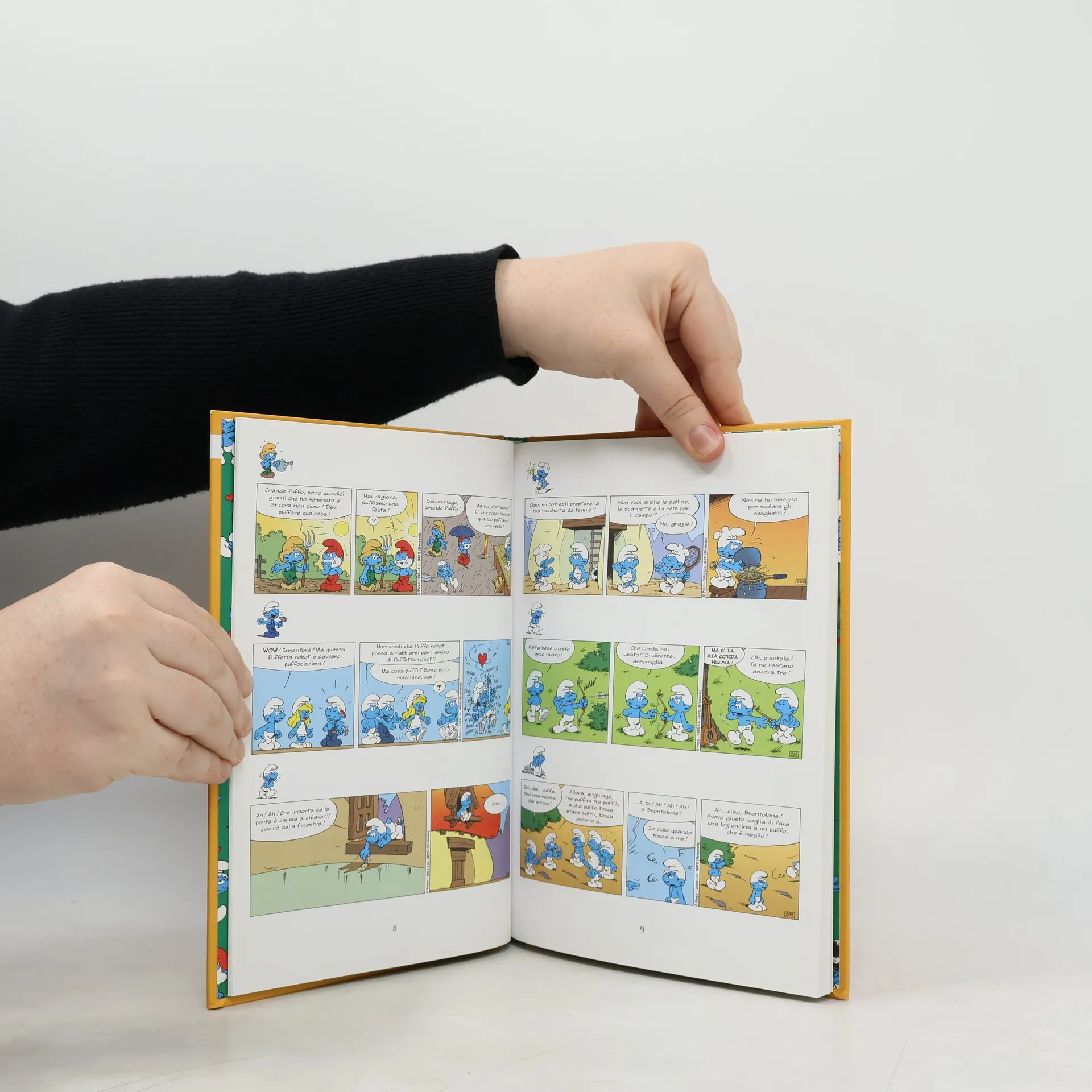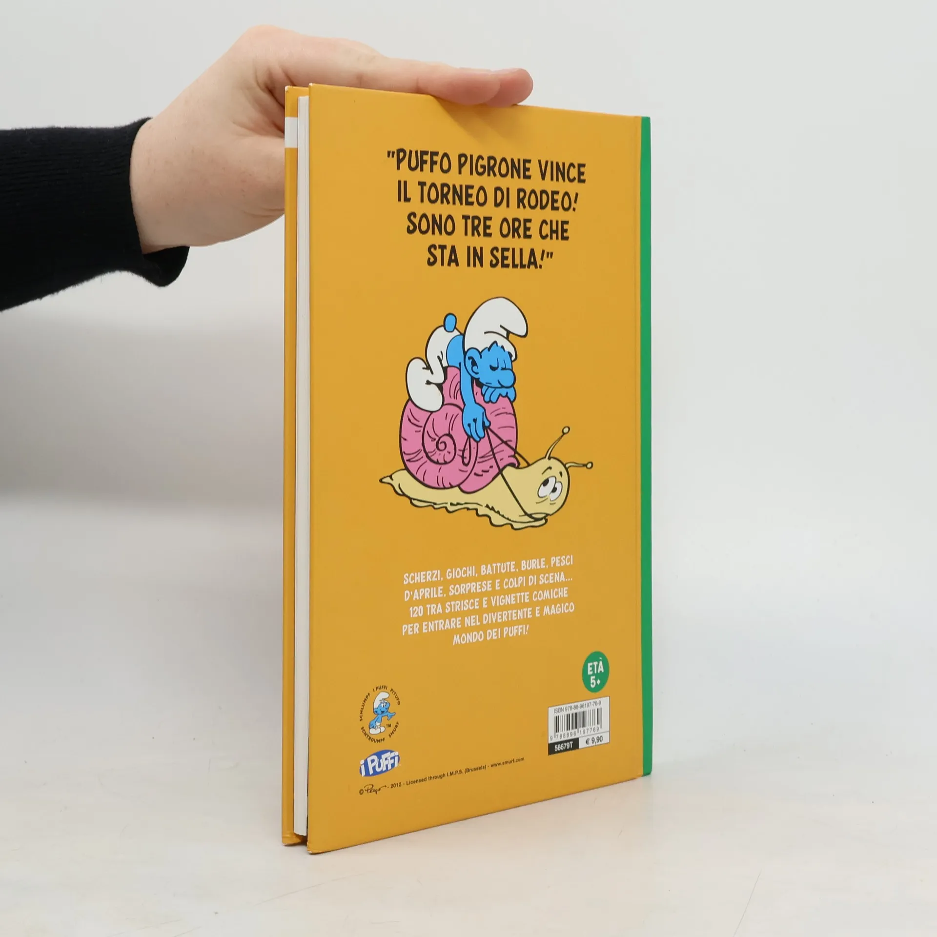 Puffo Pigrone vince il torneo di rodeo! Sono tre ore che sta in sella" Scherzi, giochi, battute, burle, pesci d'aprile, sorprese e colpi di scena... 120 tra strisce e vignette comiche per entrare nel divertente e magico mondo dei Puffi!