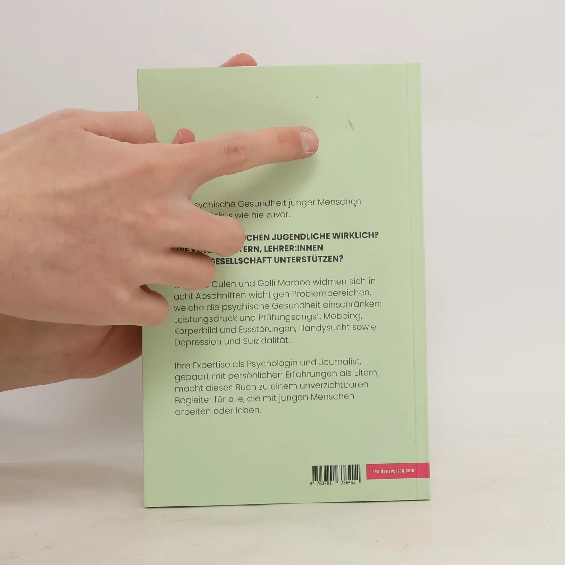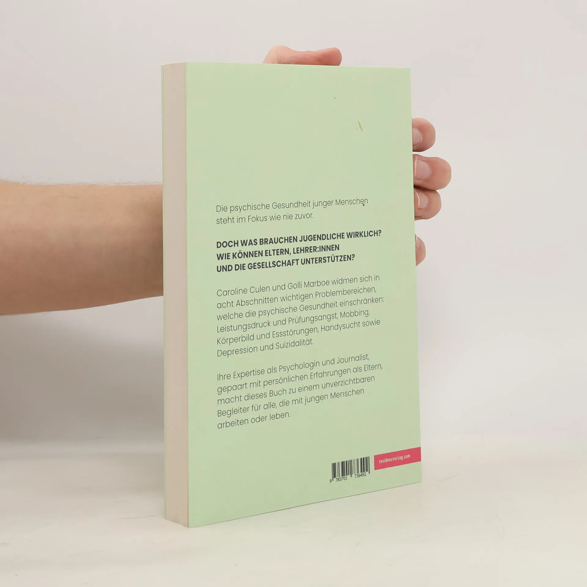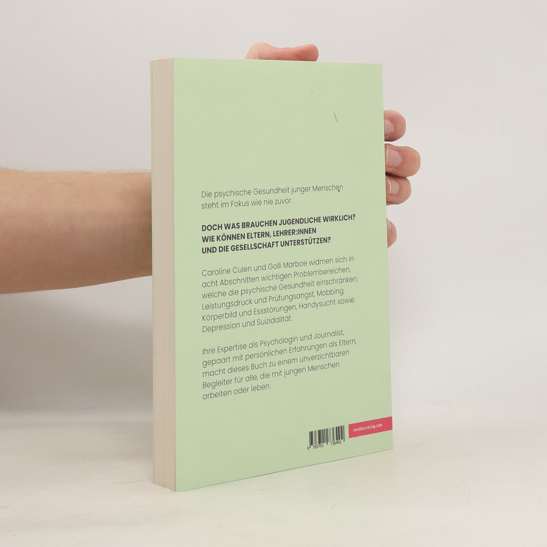 Caroline Culen und Golli Marboe widmen sich in zehn Abschnitten wichtigen Problembereichen, die die psychische Gesundheit junger Menschen einschränken, denn die neuesten Studien belegen, dass Kinder und Jugendliche anhaltend psychisch stark belastet sind. Diskussionen und Überlegungen rund um Mental Health haben in der letzten Zeit stark zugenommen. Dennoch ergeben sich viele Fragen und Unsicherheiten im Umgang mit betroffenen jungen Menschen. Sei es Leistungsdruck und Prüfungsangst oder Mobbing, Körperbild und Essstörungen, Handysucht, Depression, Suizidalität. Caroline Culen und Golli Marboe vermitteln Wissen rund um Mental Health. Sie berichten zur Veranschaulichung aus ihren beruflichen und persönlichen Erfahrungen und zeigen somit Wege im Umgang mit betroffenen jungen Menschen auf.