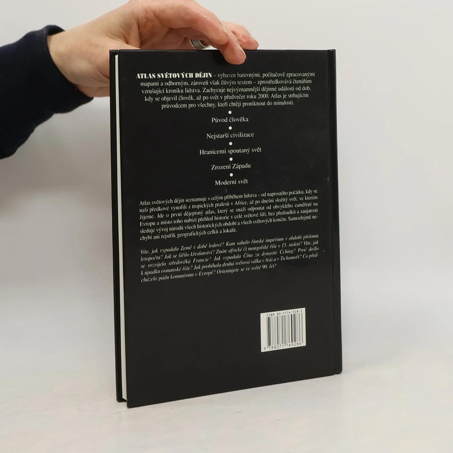 Atlas světových dějin seznamuje s celým příběhem lidstva - od naprostého počátku, kdy se naši předkové vynořili z tropických pralesů v Africe, až po dnešní složitý svět, ve kterém žijeme. Jde o první dějepisný atlas, který se snaží odpoutat od obvyklého zaměření na Evropu a místo toho nabízí přehled historie v celé světové říši, bez předsudků a zaujatosti sleduje vývoj národů všech historických období a všech světových končin. Samozřejmě nechybí ani rejstřík geografických celků a lokalit.
