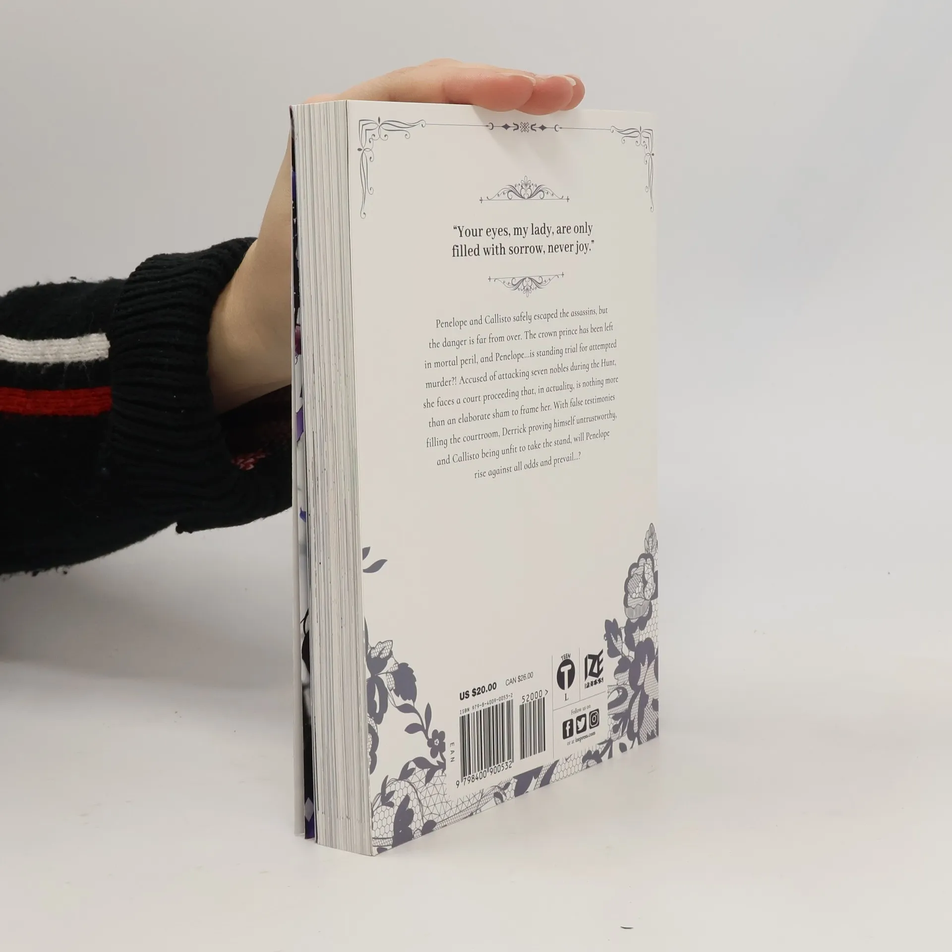 “Your eyes, my lady, are only filled with sorrow, never joy.”Penelope and Callisto safely escaped the assassins, but the danger is far from over. The crown prince has been left in mortal peril, and Penelope…is standing trial for attempted murder?! Accused of attacking seven nobles during the Hunt, she faces a court proceeding that, in actuality, is nothing more than an elaborate sham to frame her. With false testimonies filling the courtroom, Derrick proving himself untrustworthy, and Callisto being unfit to take the stand, will Penelope rise against all odds and prevail…?