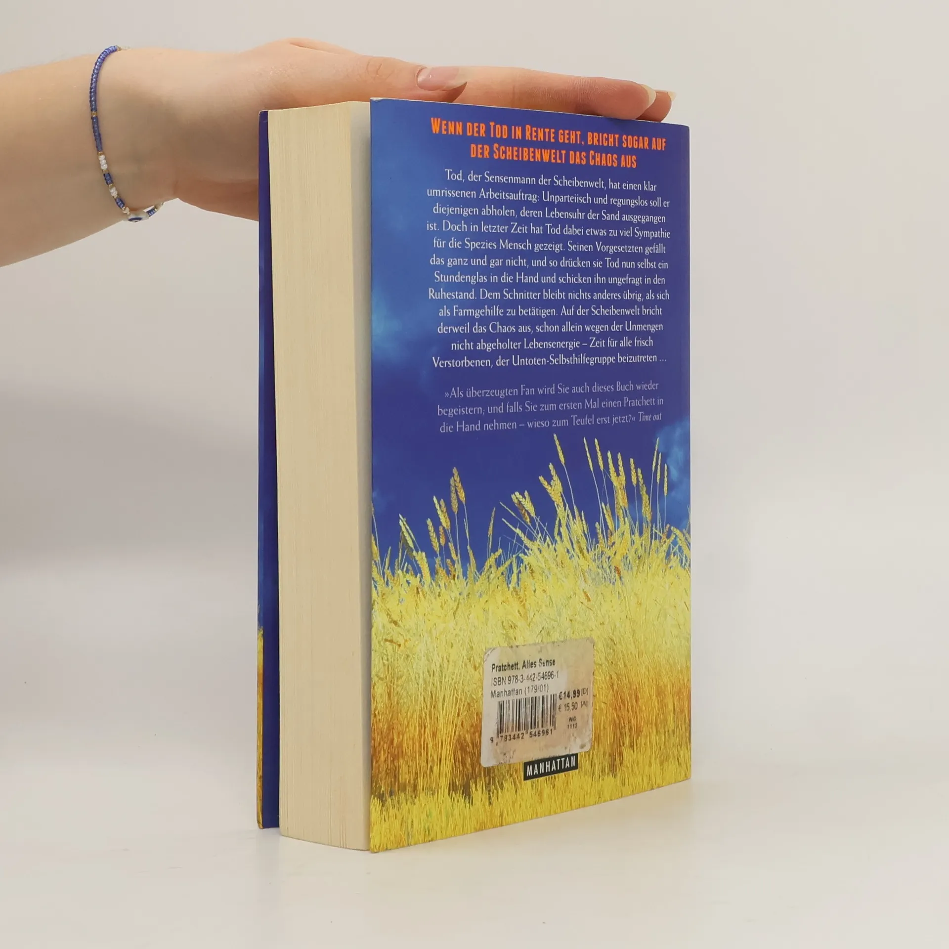 Eine der beliebtesten Figuren der Scheibenwelt übernimmt die Hauptrolle Tod, der Sensenmann der Scheibenwelt, hat einen klar umrissenen Arbeitsauftrag: Unparteiisch und regungslos soll er diejenigen abholen, deren Lebensuhr der Sand ausgegangen ist. Doch in letzter Zeit hat Tod dabei etwas zu viel Interesse und Sympathie für die Spezies Mensch gezeigt. Seinen Vorgesetzten gefällt das ganz und gar nicht, und so drücken sie Tod nun selbst ein Stundenglas in die Hand und schicken ihn ungefragt in den Ruhestand. Dem Schnitter bleibt nichts anderes übrig, als sich als Farmgehilfe zu betätigen. Auf der Scheibenwelt bricht derweil das Chaos aus, schon allein wegen der Unmengen nicht abgeholter Lebensenergie – Zeit für alle frisch Verstorbenen, der Untoten-Selbsthilfegruppe beizutreten … Klappenbroschur mit gestalteten Innenseiten und abtrennbarem Lesezeichen.