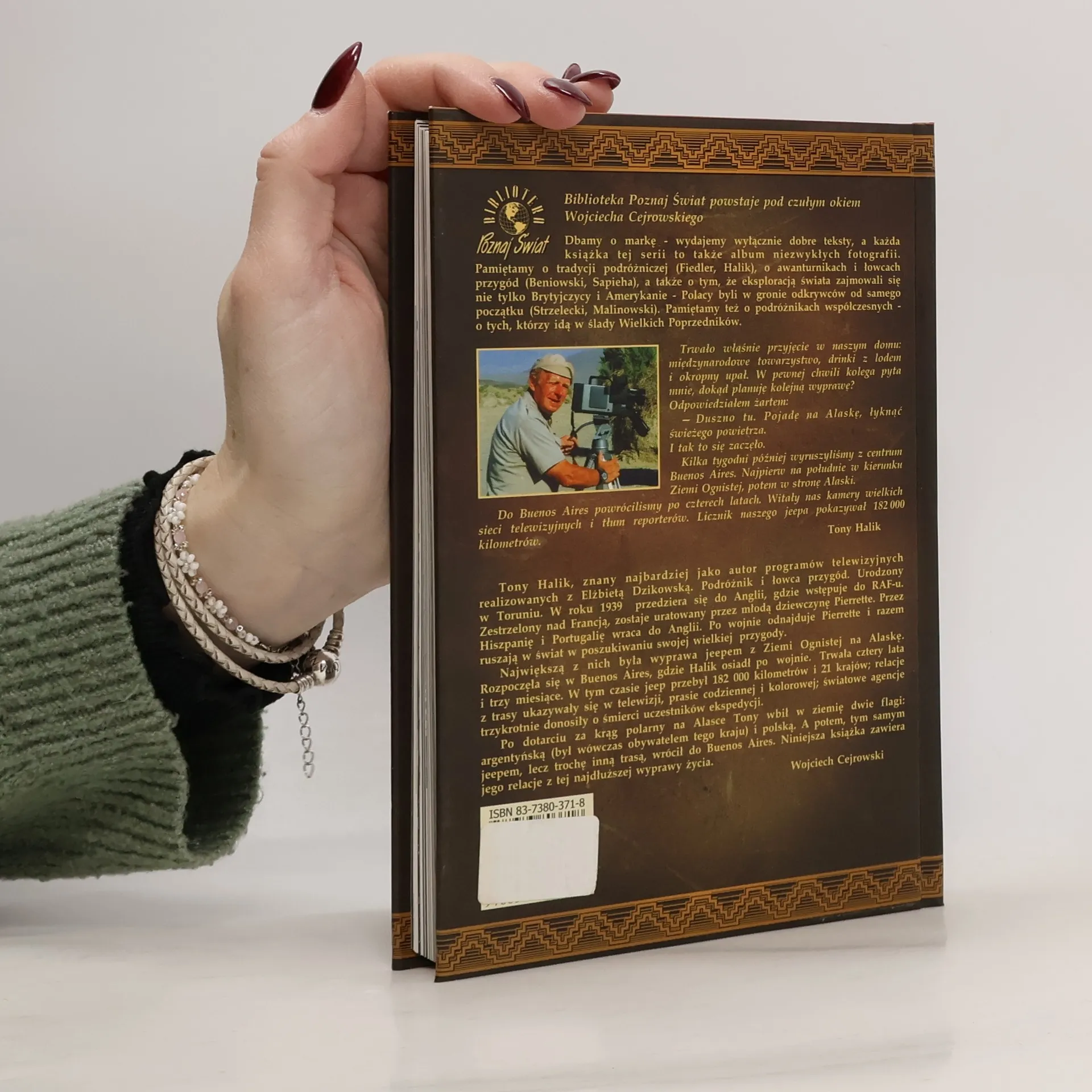 "Tony Halik, znany najbardziej jako autor programów telewizyjnych realizowanych z Elżbieta Dzikowską. Podróżnik i łowca przygód. Urodzony w Toruniu.W roku 1939 przedziera się do Anglii, gdzie wstępuje do RAF-u. Zestrzelony nad Francją, zostaje uratowany przez młodą dziewczynę Pierrette. Przez Hiszpanię i Portugalię wraca do Anglii. Po wojnie odnajduje Pierrette i razem ruszają w świat w poszukiwaniu swojej wielkiej przygody. Największą z nich była wyprawa jeepem z Ziemi Ognistej na Alaskę. Rozpoczęła się w Buenos Aires, gdzie Halik osiadł po wojnie. Trwała cztery lata i trzy miesiące. W tym czasie jeep przebył 182 000 kilometrów i 21 krajów; relacje z trasy ukazywały się w telewizji, prasie codziennej i kolorowej; światowe agencje trzykrotnie donosiły o śmierci uczestników ekspedycji. Po dotarciu za krąg polarny na Alasce Tony wbił w ziemię dwie flagi: argentyńską (był wówczas obywatelem tego kraju) i polską. A potem, tym samym jeepem, lecz trochę inną trasą, wrócił do Buenos Aires. Niniejsza książka zawiera jego relacje z tej najdłuższej wyprawy życia." - Wojciech Cejrowski