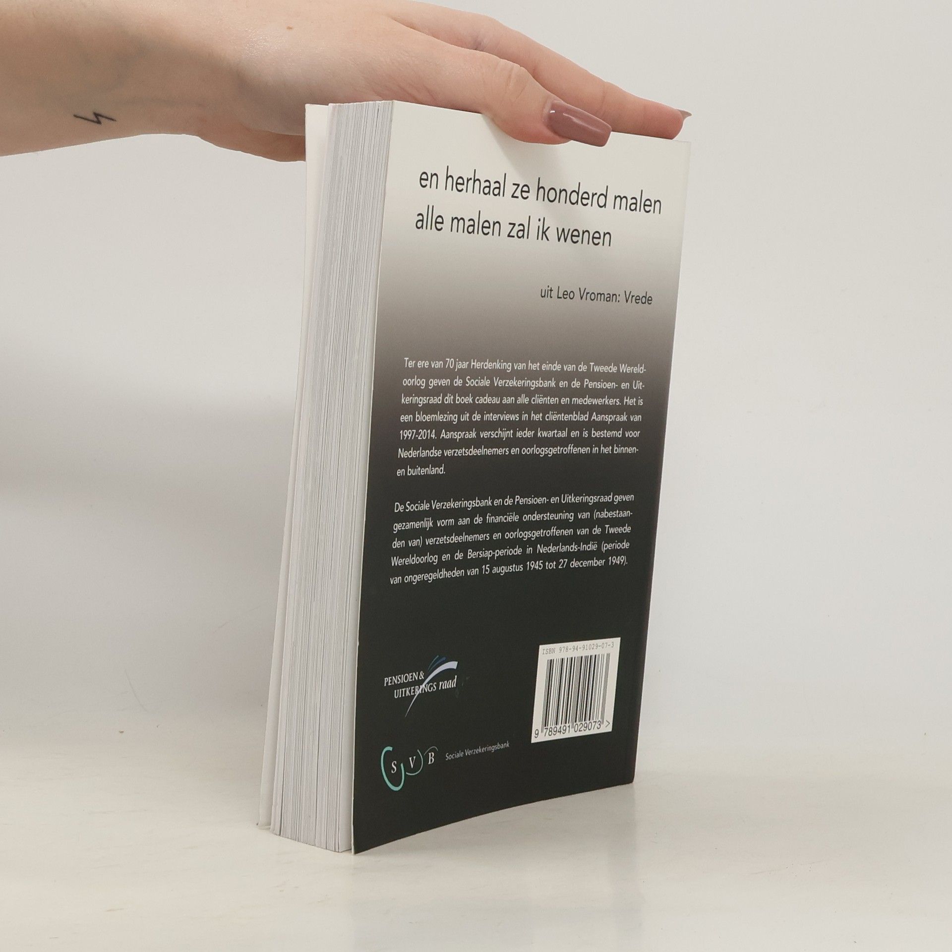 Bloemlezing van interviews met oorlogsgetroffenen en verzetsdeelnemers van de Tweede Wereldoorlog. De verhalen uit Europa en Nederlands-Indië zijn afkomstig uit het cliëntenblad Aanspraak van de Sociale Verzekeringsbank van 1997 tot 2014. Het boek is uitgebracht ter ere van de 70-jarige herdenking van het einde van de Tweede Wereldoorlog.