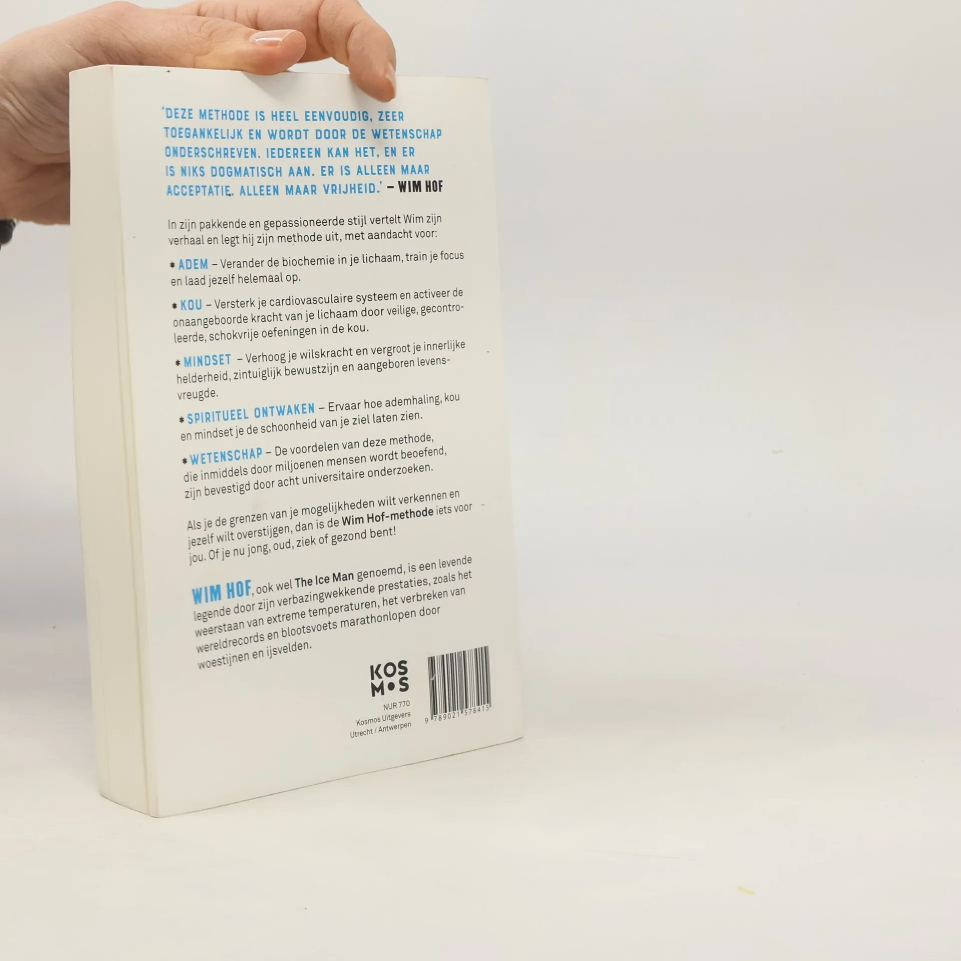 De enige autorizované boek van Wim Hof představuje převratnou metodu, která nám umožňuje využít náš fyzický i duševní potenciál. Wim Hof, známý jako Ledový muž, ohromuje svět svými neuvěřitelnými výkony, jako je strávení téměř dvou hodin v ledové vodě, běhání maratonů bez vody a výstupy na Mount Everest bez kyslíku. Tyto rekordy mohou vypadat nepochopitelně, ale Hof tvrdí, že podobných schopností může dosáhnout každý z nás. Na základě svých zkušeností vytvořil metodu, která mění pohled na lidské možnosti a aktivuje nevyužité schopnosti, bez ohledu na věk či zdravotní stav. Kniha nabízí osobní pohled na Hofův život a zákulisí jeho rekordů. Vysvětluje základní principy jeho metody, včetně technik dýchání, práce s chladem, nastavení mysli a souvislostí se zdravím a spirituálním rozvojem. Hof ukazuje, že naše limity jsou určeny pouze hloubkou naší představivosti a silou přesvědčení.