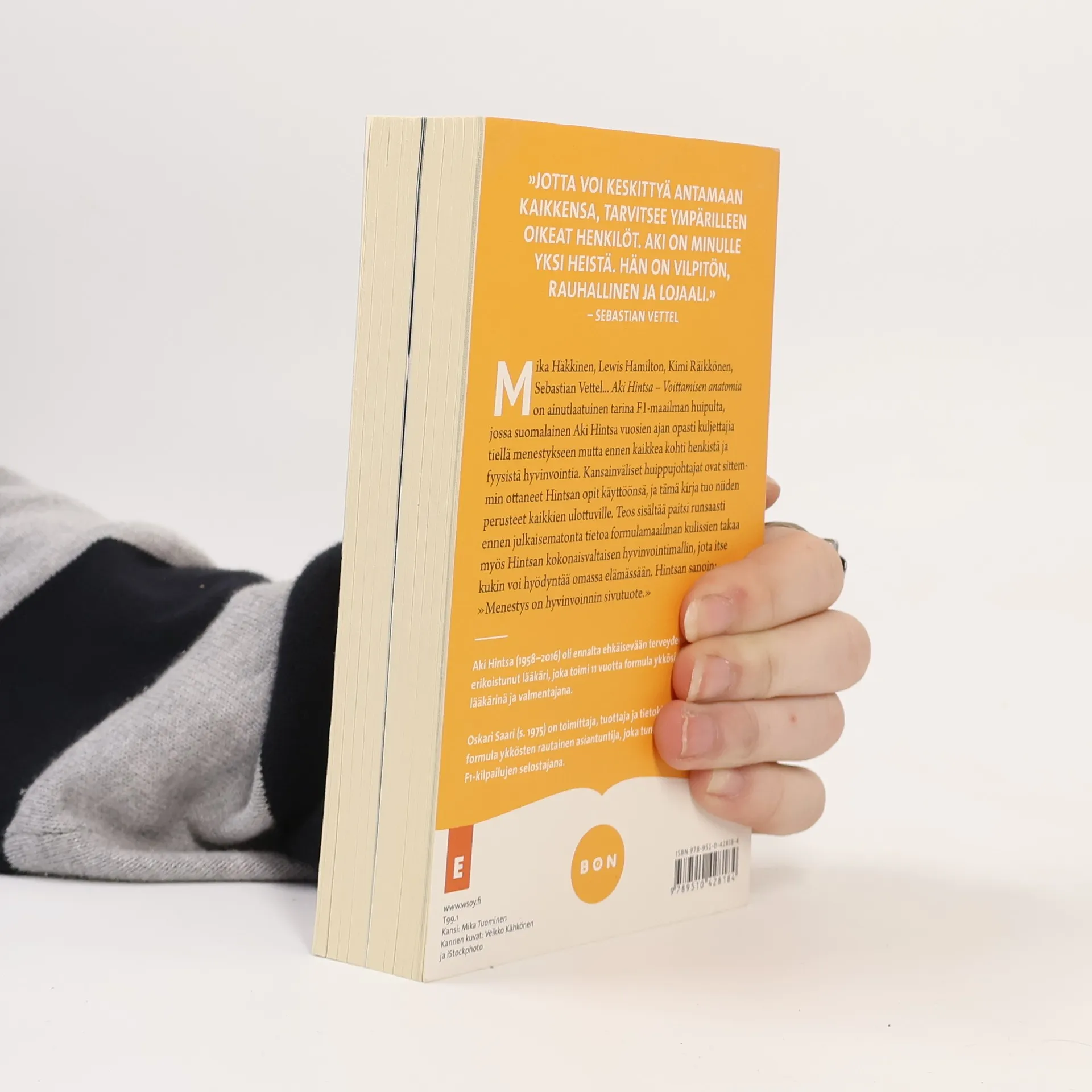 Mika Häkkinen, Lewis Hamilton, Kimi Räikkönen, Sebastian Vettel… Aki Hintsa – Voittamisen anatomia on ainutlaatuinen tarina F1-maailman huipulta, jossa suomalainen Aki Hintsa leipoo kuljettajista mestareita. Sittemmin kansainväliset huippujohtajat ovat ottaneet Hintsan opit käyttöönsä. Teos sisältää runsaasti ennen julkaisematonta tietoa formulamaailman kulissien takaa sekä Hintsan kokonaisvaltaisen toimintamallin, jota voivat omassa elämässään hyödyntää ihan tavallisetkin tallaajat. Matka kohti menestystä alkaa kysymyksellä: Kuka olet? Aki Hintsa (1958 – 2016) työskenteli ennalta ehkäisevään terveydenhuoltoon erikoistuneena lääkärinä ja toimi 11 vuotta Formula 1:ssä varikkolääkärinä ja valmentajana. Hintsa pyöritti myös Genevessä erikoisklinikkaa, jonka asiakkaita ovat kansainväliset huippujohtajat ja -urheilijat. Klinikan tavoitteena on parantaa kokonaisvaltaisella ja yksilöllisellä tavalla asiakkaidensa henkistä ja fyysistä suorituskykyä sekä elämänlaatua. Hintsa työskenteli lähetyslääkärinä Etiopiassa 1990-luvun lopulla. Oskari Saari (s. 1975) on toimittaja, tuottaja ja tietokirjailija. Saari on formula ykkösten rautainen asiantuntija, joka tunnetaan Suomessa F1-kilpailujen selostajana.