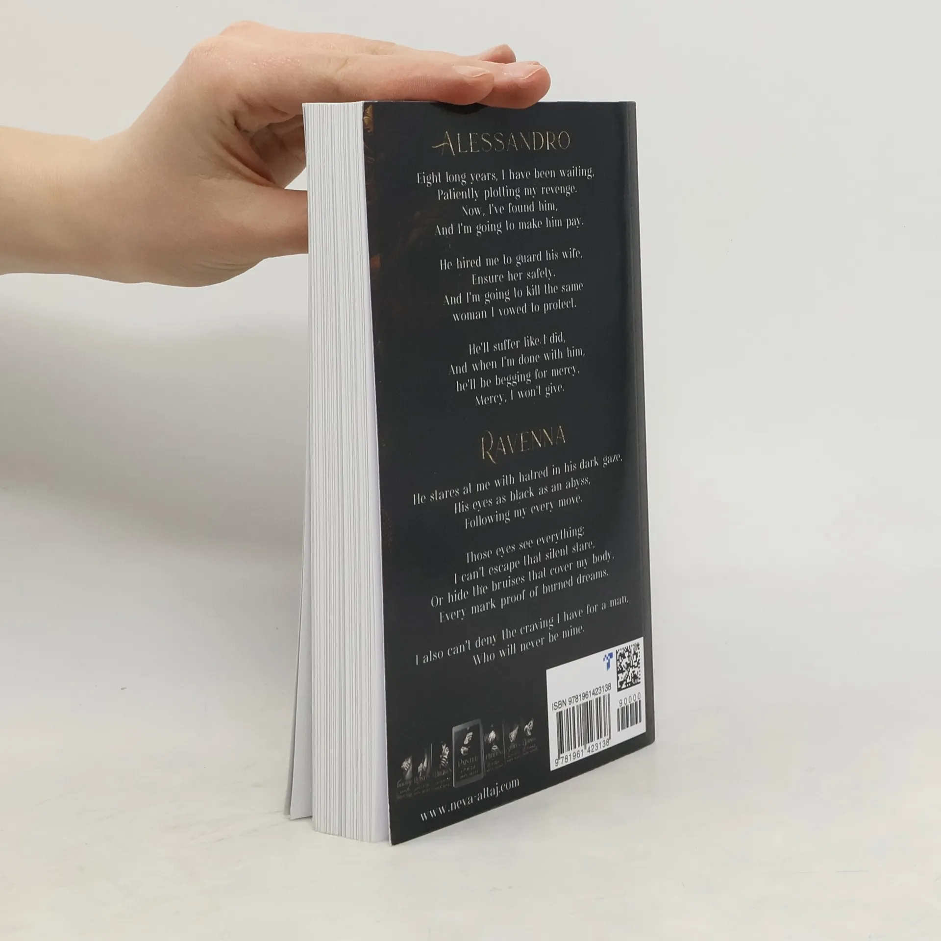 AlessandroEight long years, I have been waiting,Patiently plotting my revenge.Now, I've found him,And I'm going to make him pay.He hired me to guard his wife,Ensure her safety.And I'm going to kill the same woman I vowed to protect.He'll suffer like I did,And when I'm done with him, he'll be begging for mercy,Mercy, I won't give.RavennaHe stares at me with hatred in his dark gaze,His eyes as black as an abyss,Following my every move.Those eyes see everything;I can't escape that silent stare,Or hide the bruises that cover my body,Every mark proof of burned dreams.I also can't deny the craving I have for a man,Who will never be mine.