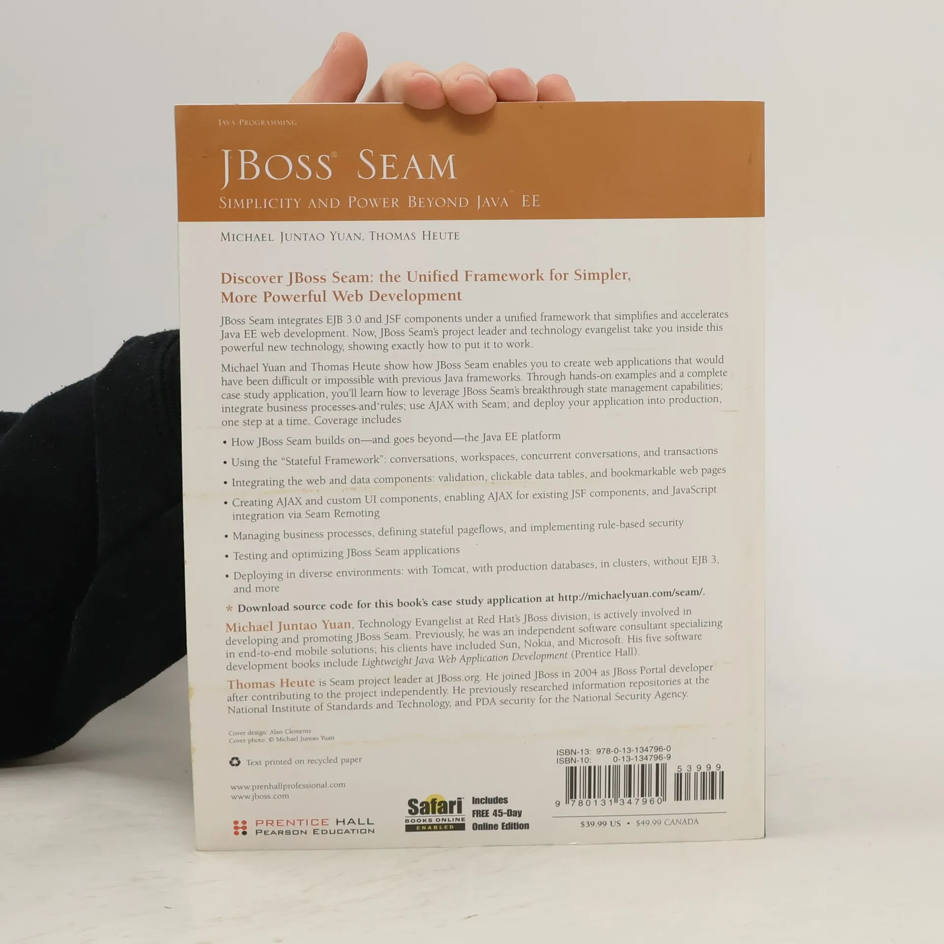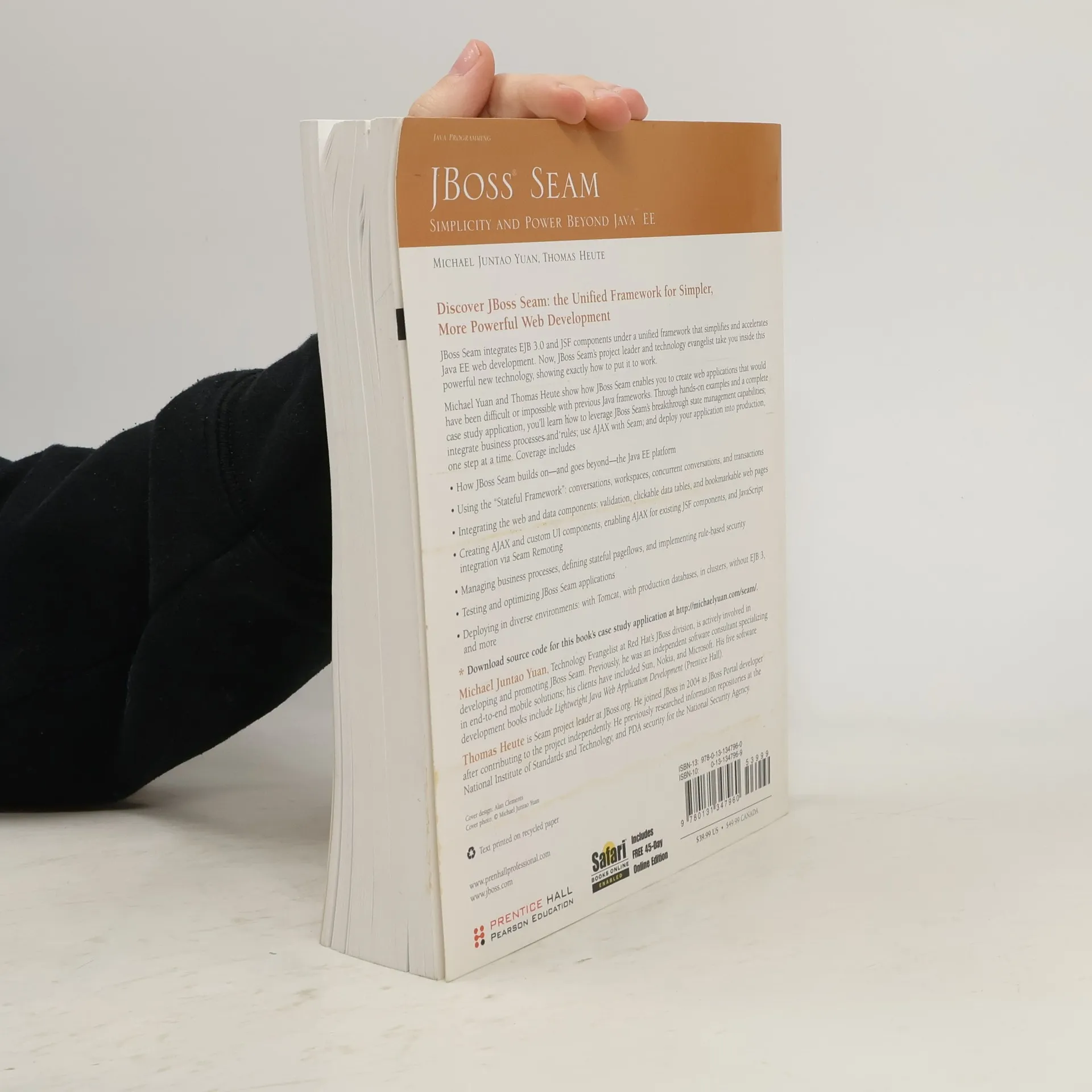 A new edition of this title is available, 0137129394 9780137129393 Discover JBoss the Unified Framework for Simpler, More Powerful Web Development JBoss Seam integrates EJB 3.0 and JSF components under a unified framework that simplifies and accelerates Java EE web development. Now, JBoss Seam’s project leader and technology evangelist take you inside this powerful new technology, showing exactly how to put it to work. Michael Yuan and Thomas Heute show how JBoss Seam enables you to create web applications that would have been difficult or impossible with previous Java frameworks. Through hands-on examples and a complete case study application, you’ll learn how to leverage JBoss Seam’s breakthrough state management capabilities; integrate business processes and rules; use AJAX with Seam; and deploy your application into production, one step at a time. Coverage includes How JBoss Seam builds on—and goes beyond—the Java EE platform • Using the “Stateful Framework”: conversations, workspaces, concurrent conversations, and transactions • Integrating the web and data validation, clickable data tables, and bookmarkable web pages • Creating AJAX and custom UI components, enabling AJAX for existing JSF components, and JavaScript integration via Seam Remoting • Managing business processes, defining stateful pageflows, and implementing rule-based security • Testing and optimizing JBoss Seam applications • Deploying in diverse with Tomcat, with production databases, in clusters, without EJB 3, and more * Download source code for this book’s case study application at www.prenhallprofessional.com www.jboss.com About This BookAbout the AuthorsAcknowledgments Part Getting StartedChapter 1: What Is Seam?Chapter 2: Seam Hello WorldChapter 3: Recommended JSF EnhancementsChapter 4: Rapid Application Development ToolsPart Stateful Applications Made EasyChapter 5: An Introduction to Stateful FrameworkChapter 6: A Simple Stateful ApplicationChapter 7: ConversationsChapter 8: Workspaces and Concurrent ConversationsChapter 9: TransactionsPart Integrating Web and Data ComponentsChapter 10: Validate Input DataChapter 11: Clickable Data TablesChapter 12: Bookmarkable Web PagesChapter 13: The Seam CRUD Application FrameworkChapter 14: Failing GracefullyPart AJAX SupportChapter 15: Custom and AJAX UI ComponentsChapter 16: Enabling AJAX for Existing ComponentsChapter 17: Direct JavaScript IntegrationPart Business Processes and RulesChapter 18: Managing Business ProcessesChapter 19: Stateful PageflowsChapter 20: Rule-Based Security FrameworkPart Testing Seam ApplicationsChapter 21: Unit TestingChapter 22: Integration TestingPart Production DeploymentChapter 23: Java EE 5.0 DeploymentChapter 24: Seam Without EJB3Chapter 25: Tomcat DeploymentChapter 26: Using a Production DatabaseChapter 27: Performance Tuning and ClusteringAppendix Installing and Deploying JBoss ASAppendix Using Example Applications as TemplatesIndex