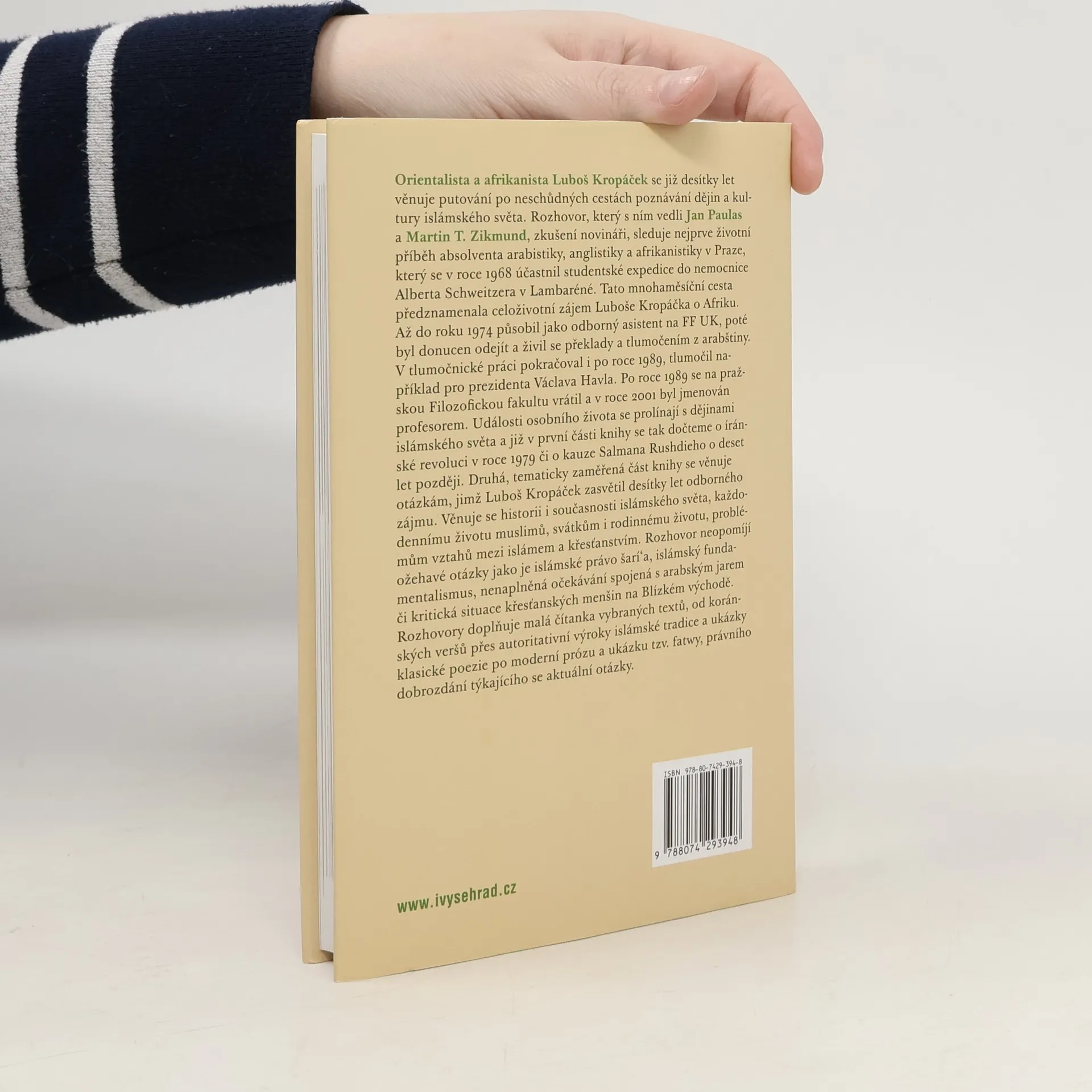 Rozhovor s autorem oblíbené knihy Duchovní cesty islámu. Islamolog a afrikanista Luboš Kropáček se již desítky let věnuje putování po neschůdných cestách poznávání dějin a kultury islámského světa. Rozhovor, který s ním vedli dva zkušení novináři, sleduje nejprve životní příběh absolventa arabistiky, anglistiky a afrikanistiky v Praze, který se v roce 1968 účastnil studentské expedice do nemocnice Alberta Schweitzera v Lambaréné. Tato mnohaměsíční cesta předznamenala celoživotní zájem Luboše Kropáčka o Afriku. Až do roku 1974 působil jako odborný asistent na FF UK , poté byl donucen odejít a živil se překlady a tlumočením z arabštiny. Po roce 1989 se na fakultu vrátil, v roce 2001 byl jmenován profesorem. Luboš Kropáček je autorem mnoha úspěšných knih o dějinách, kultuře a duchovnosti islámského světa. Připomeňme asi nejznámější, opakovaně vydávaný přehled Duchovní cesty islámu (Vyšehrad, 5. vydání 2011). Islám, islámský fundamentalismus a život muslimské společnosti proto představují druhé významné téma knihy. Tím třetím je křesťanská víra, pevný základ a opora v mnoha nelehkých životních situacích. I o nich je možné se v knize rozhovorů s jednou z výrazných osobností české vzdělanosti dočíst.