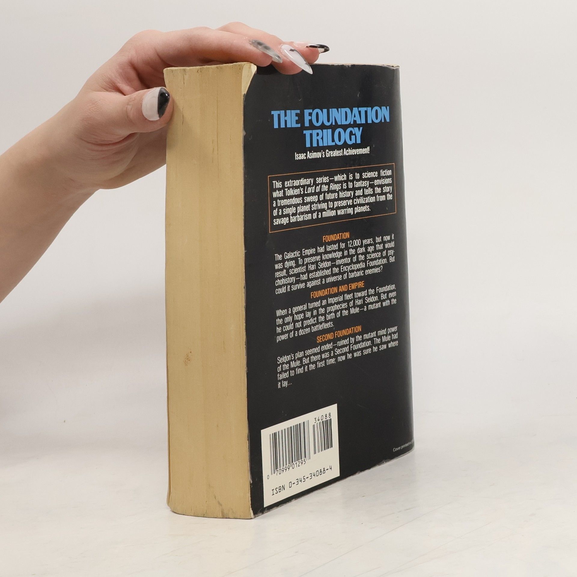 A THOUSAND-YEAR EPIC, A GALACTIC STRUGGLE, A MONUMENTAL WORK IN THE ANNALS OF SCIENCE FICTION <br /><br />FOUNDATION begins a new chapter in the story of man's future. As the Old Empire crumbles into barbarism throughout the million worlds of the galaxy, Hari Seldon and his band of psychologists must create a new entity, the Foundation-dedicated to art, science, and technology-as the beginning of a new empire. <br /><br />FOUNDATION AND EMPIRE describes the mighty struggle for power amid the chaos of the stars in which man stands at the threshold of a new enlightened life which could easily be destroyed by the old forces of barbarism. <br /><br />SECOND FOUNDATION follows the Seldon Plan after the First Empire's defeat and describes its greatest threat-a dangerous mutant strain gone wild, which produces a mind capable of bending men's wills, directing their thoughts, reshaping their desires, and destroying the universe.