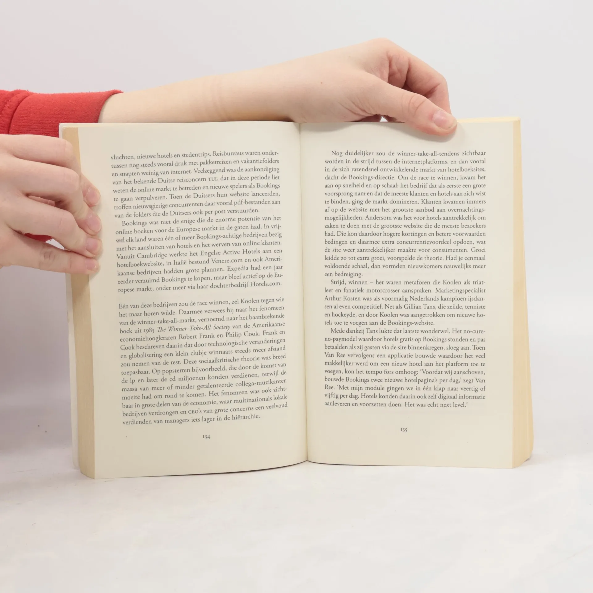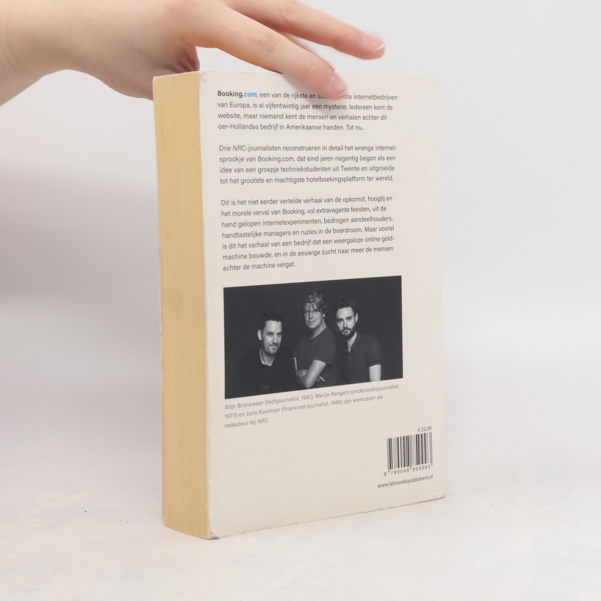 "Booking.com, een van de rijkste en succesvolste internetbedrijven van Europa, is al vijfentwintig jaar een mysterie. Iedereen kent de website, maar niemand kent de mensen en verhalen achter dit oer-Hollandse bedrijf in Amerikaanse handen. Tot nu. Drie NRC-journalisten reconstrueren in detail het wrange internetsprookje van Booking.com, dat eind jaren negentig begon als een idee van een groepje techniekstudenten uit Twente en uitgroeide tot het grootste en machtigste hotelboekingsplatform ter wereld. Dit is het niet eerder vertelde verhaal van de opkomst, hoogtij en het morele verval van Booking, vol extravagante feesten, uit de hand gelopen internetexperimenten, bedrogen aandeelhouders, handtastelijke managers en ruzies in de boardroom. Maar vooral is dit het verhaal van een bedrijf dat een weergaloze online geldmachine bouwde, en in de eeuwige zucht naar meer de mensen achter de machine vergat." -- Back cover.