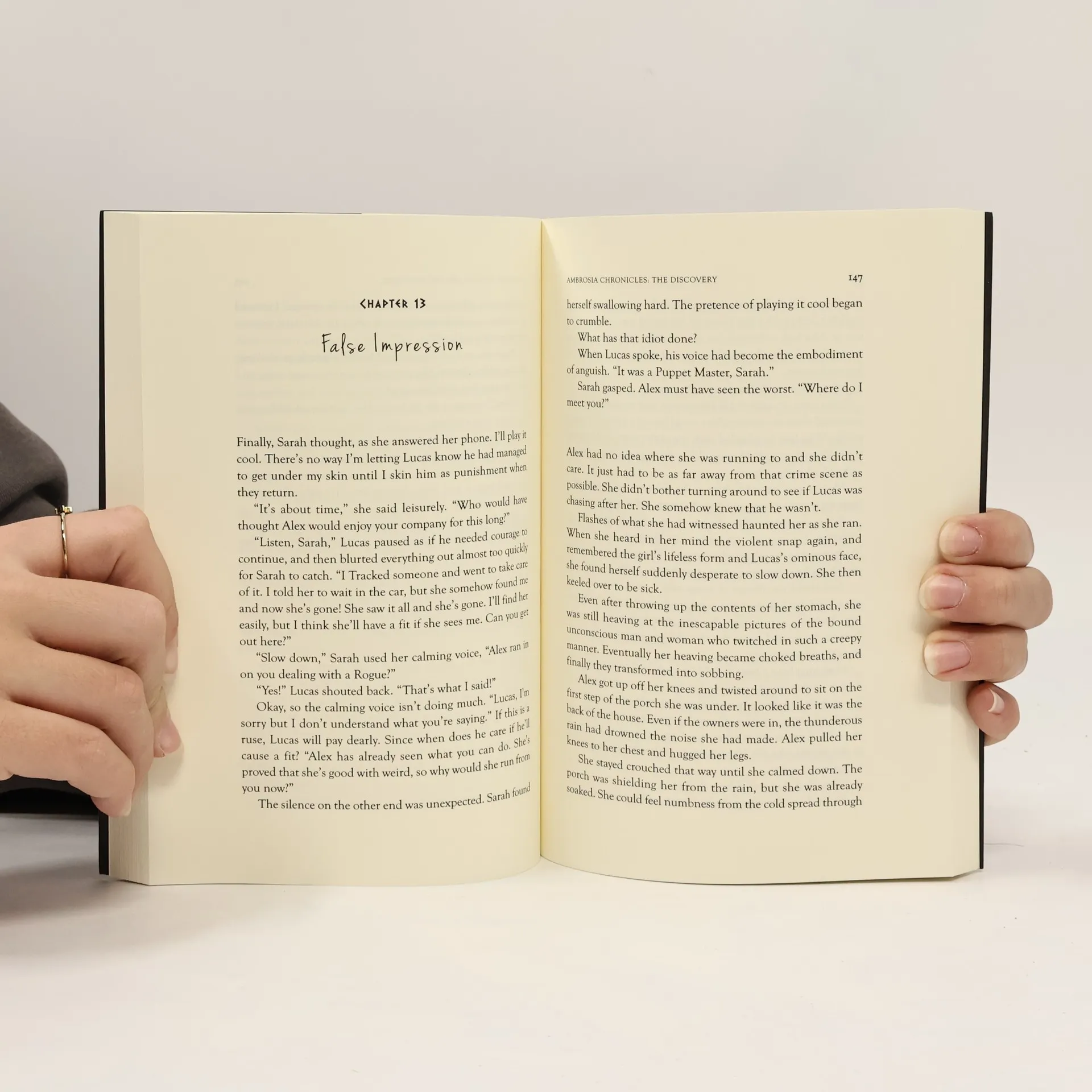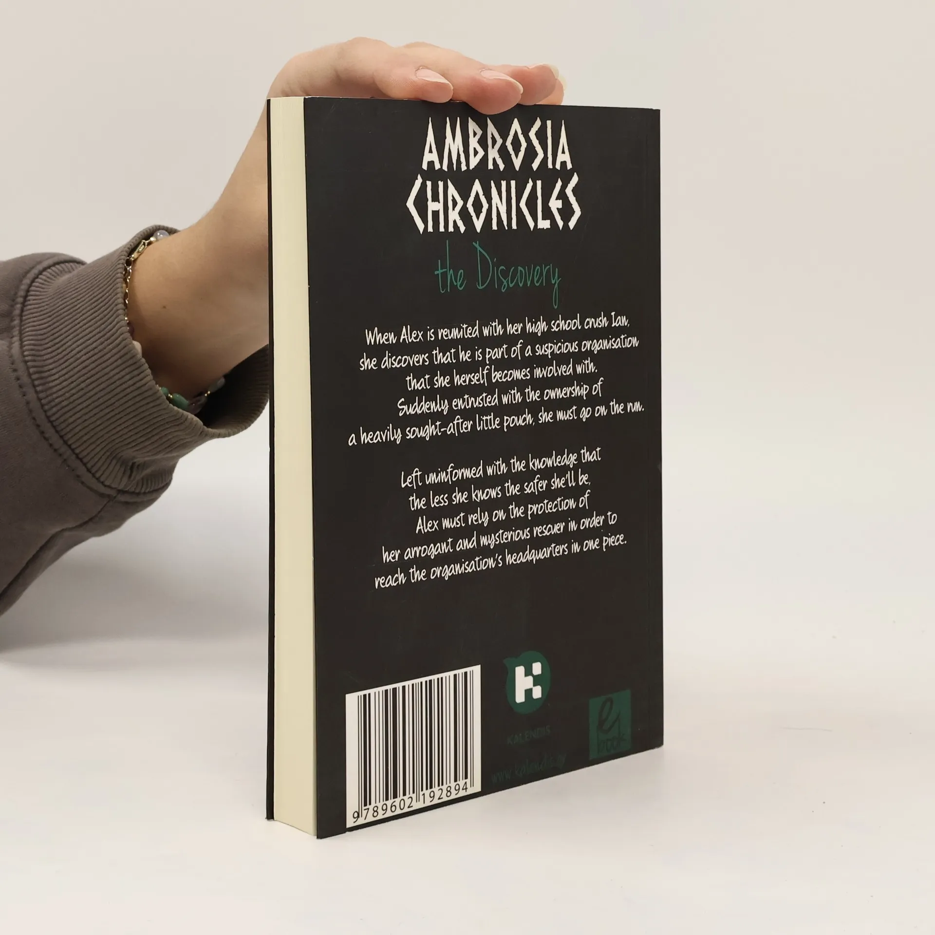 When Alex is reunited with her high school crush, Ian, she discovers that he is part of a suspicious organisation that she herself becomes involved with. Suddenly entrusted with a heavily sought-after little pouch, she must go on the run. Alex must let go of the frustrations of ignorance at her new circumstances with the knowledge that the less she knows the safer she'll be, while she relies on the protection of her arrogant and mysterious rescuer in order to reach the organisation's headquarters in one piece. This is the first volume of an action-packed romantic fantasy trilogy. Readers are introduced to Alex, a law freshman who struggles with school, friends, and body-imagery (and other more supernatural things) as the story plays with Greek mythology. The supernatural elements are keyed down in this first volume, while developing relations between the characters are what drive the story.