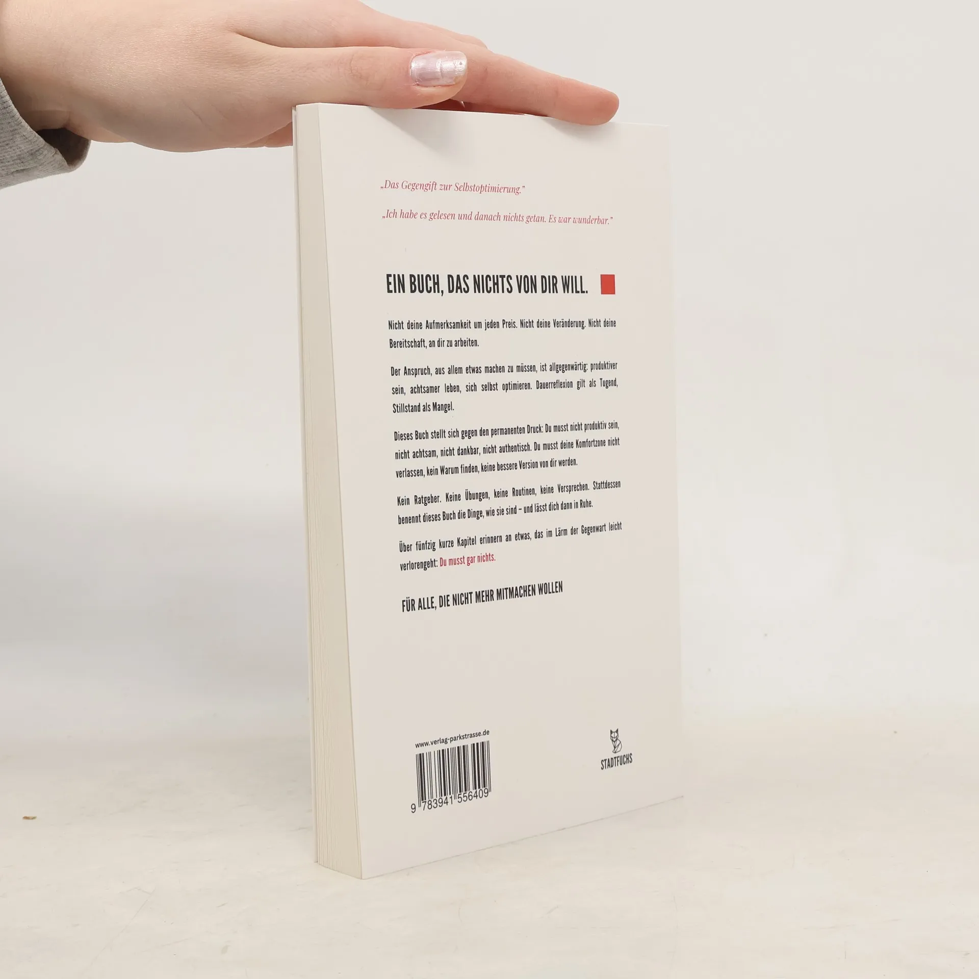 Die Welt ist voller Ratschläge. Sei produktiv. Sei achtsam. Sei authentisch. Verlass deine Komfortzone. Arbeite an dir. Finde dein Warum. Der Druck kommt von allen Seiten – und irgendwann glaubt man, dass man tatsächlich all das muss. Dieses Buch sagt: Nein. In 54 kurzen Kapiteln zerlegt Martin Brunner die Glaubenssätze der Selbstoptimierungskultur. Ohne Zynismus, ohne erhobenen Zeigefinger – aber mit der Klarheit, die entsteht, wenn jemand aufhört, den Lärm für Wahrheit zu halten. Kein Ratgeber, der verbessern will. Keine Schritte zu einem besseren Ich. Keine Morgenroutine, kein Vision-Board, keine Challenge. Nur Erlaubnisse, die sich niemand erteilen muss außer sich selbst. Für alle, die nicht mehr mitmachen wollen.