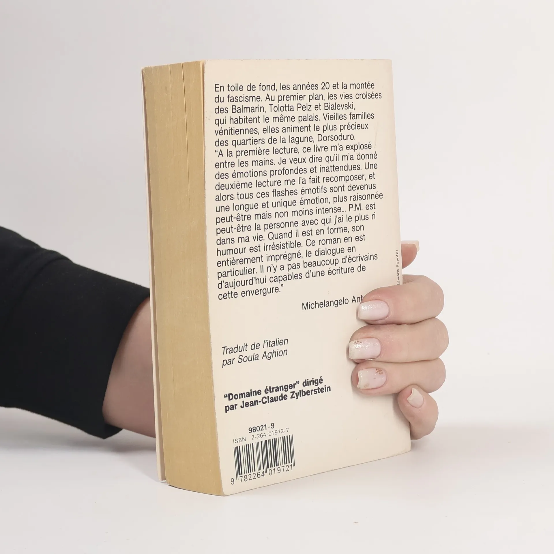 En toile de fond, les années 20 et la montée du fascisme. Au premier plan, les vies croisées des Balmarin, Tolotta'Pelz et Bialevski, qui habitent le même palais. Vieilles familles vénitiennes, elles animent le plus précieux des quartiers de la lagune, Dorsoduro. " A la première lecture, ce livre m'a explosé entre les mains. Je veux dire qu'il m'a donné des émotions profondes et inattendues. Une deuxième lecture me l'a fait recomposer, et alors tous ces flashes émotifs sont devenus une longue et unique émotion, plus raisonnée peut-être mais non moins intense... P.M. est peut-être la personne avec qui j'ai le plus ri dans ma vie. Quand il est en forme, son humour est irrésistible. Ce roman en est entièrement imprégné, le dialogue en particulier. Il n'y a pas beaucoup d'écrivains d'aujourd'hui capables d'une écriture de cette envergure. " Michelangelo Antonioni.
