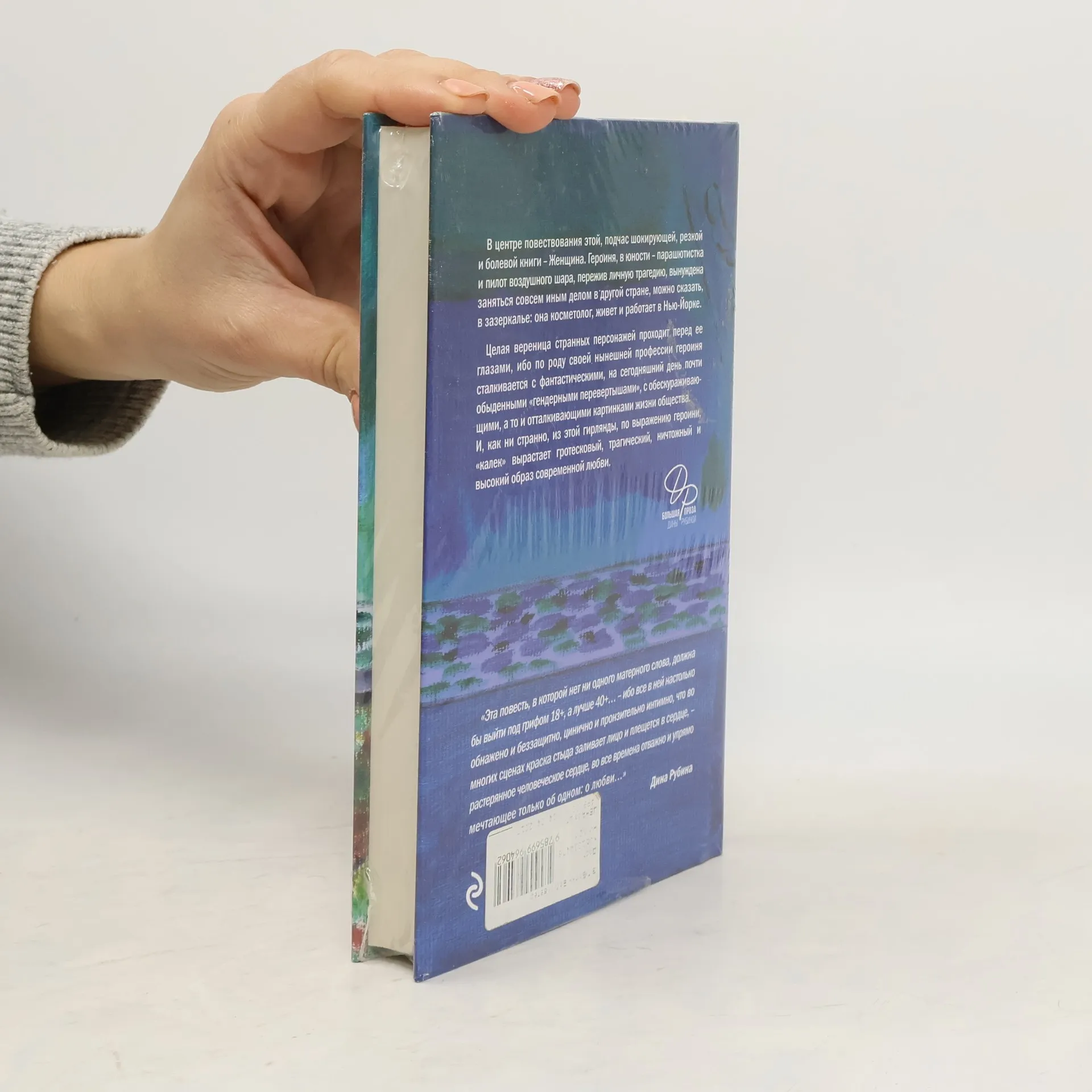 V centre povestvovanija jetoj, podchas shokirujushhej, rezkoj i bolevoj knigi - Zhenshhina. Geroinja, v junosti - parashjutistka i pilot vozdushnogo shara, perezhiv lichnuju tragediju, vynuzhdena zanjat'sja sovsem inym delom v drugoj strane, mozhno skazat', v zazerkal'e: ona kosmetolog, zhivet i rabotaet v N'ju-Jorke. Celaja verenica strannyh personazhej prohodit pered ee glazami, ibo, po rodu svoej nyneshnej professii, geroinja stalkivaetsja s fantasticheskimi, na segodnjashnij den' pochti obydennymi gendernymi perevertyshami, s obeskurazhivajushhimi, a to i ottalkivajushhimi kartinkami zhizni obshhestva. I, kak ni stranno, iz jetoj girljandy, po vyrazheniju geroini, kalek vyrastaet groteskovyj, tragicheskij, nichtozhnyj i vysokij obraz sovremennoj ljubvi. Jeta povest', v kotoroj net ni odnogo maternogo slova, dolzhna by vyjti pod grifom 18+, a luchshe 40+ - ibo vse v nej nastol'ko obnazheno i bezzashhitno, cinichno i pronzitel'no intimno, chto vo mnogih scenah kraska styda zalivaet lico i pleshhetsja v serdce, - rasterjannoe chelovecheskoe serdce, vo vse vremena otvazhno i uprjamo mechtajushhee tol'ko ob odnom: o ljubvi. Dina Rubina