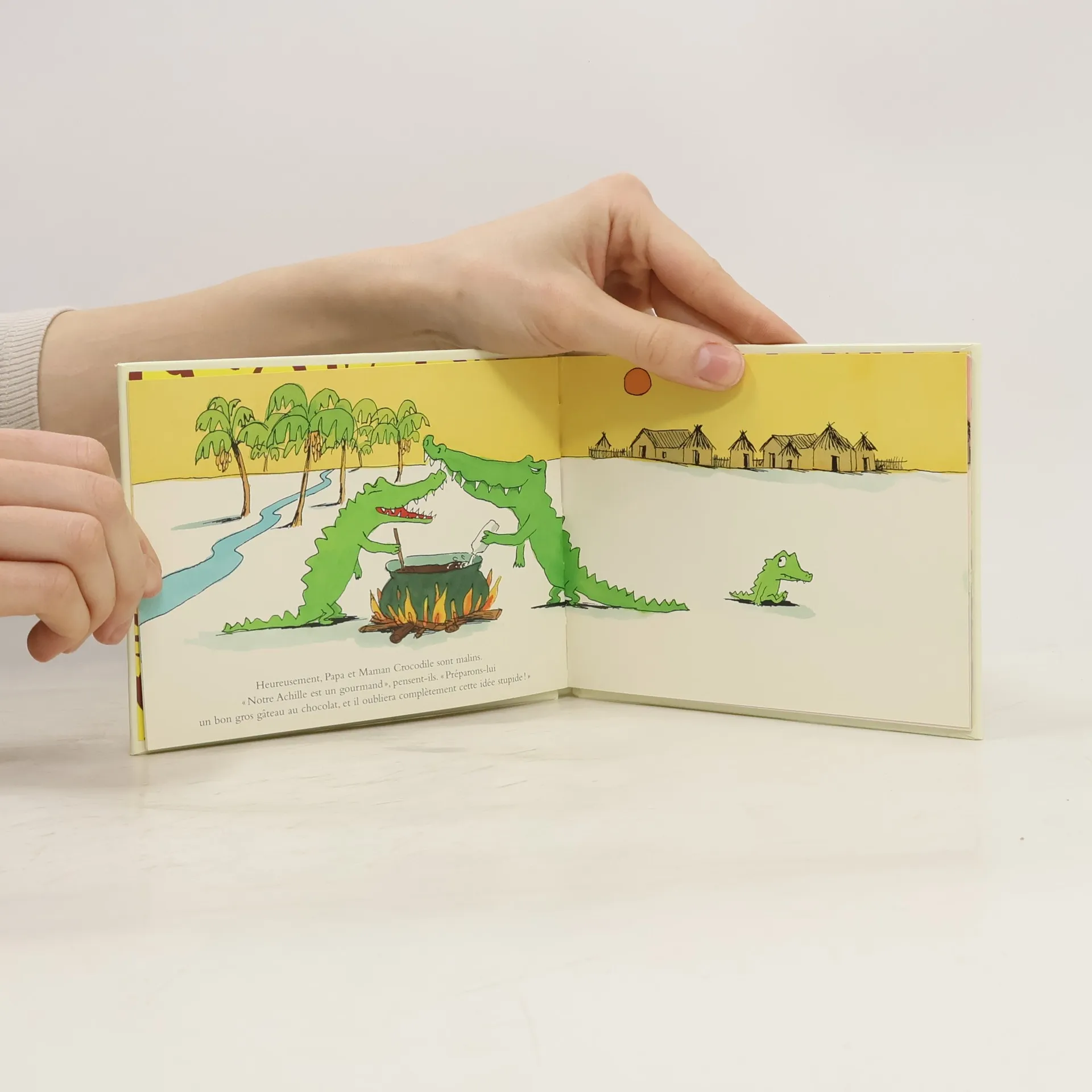 Chaque matin, maman Crocodile apporte à Achille de bonnes bananes pour son petit déjeuner, et chaque matin, elle s'émerveille : « Mon fils, comme tu es grand, comme tu es beau, comme tu as de belles dents ! » Mais un matin, Achille ne mange rien. Il ne veut pas de bananes. Ce qu'il veut, c'est manger un enfant. Ses parents s'inquiètent. Ils lui apportent une saucisse grosse comme un camion. Ils lui préparent un énorme gâteau au chocolat. Rien à faire. Ce que veut Achille, c'est manger un enfant. Qu'est-ce qui pourrait lui ôter cette idée de la tête ? De rencontrer un enfant, peut-être ?